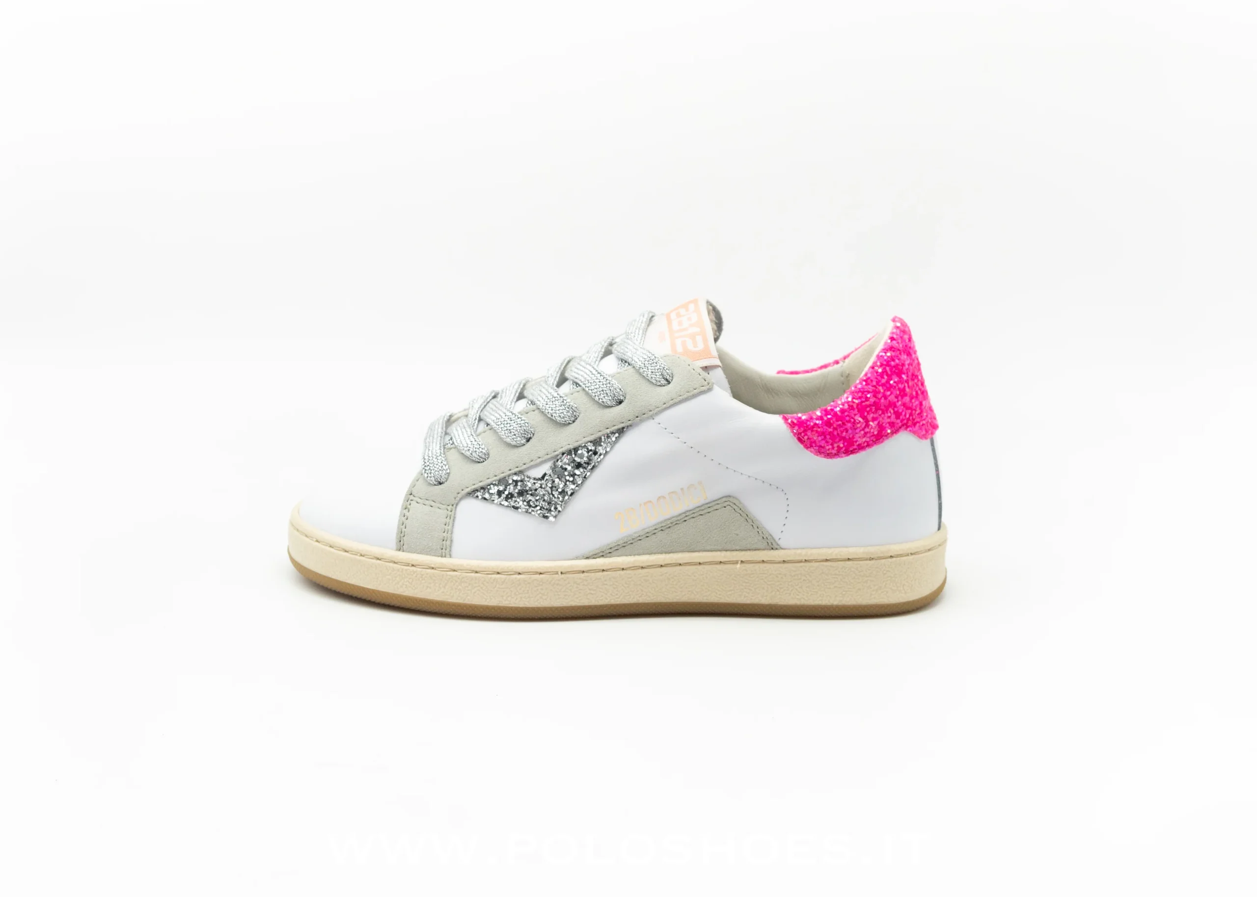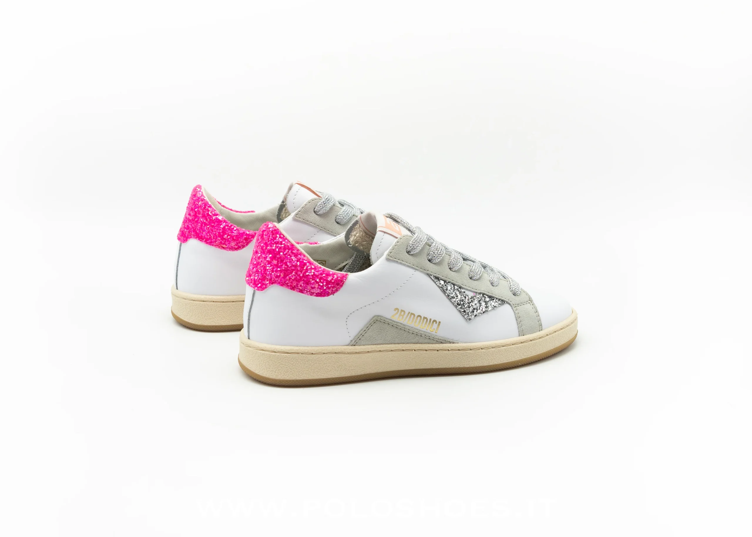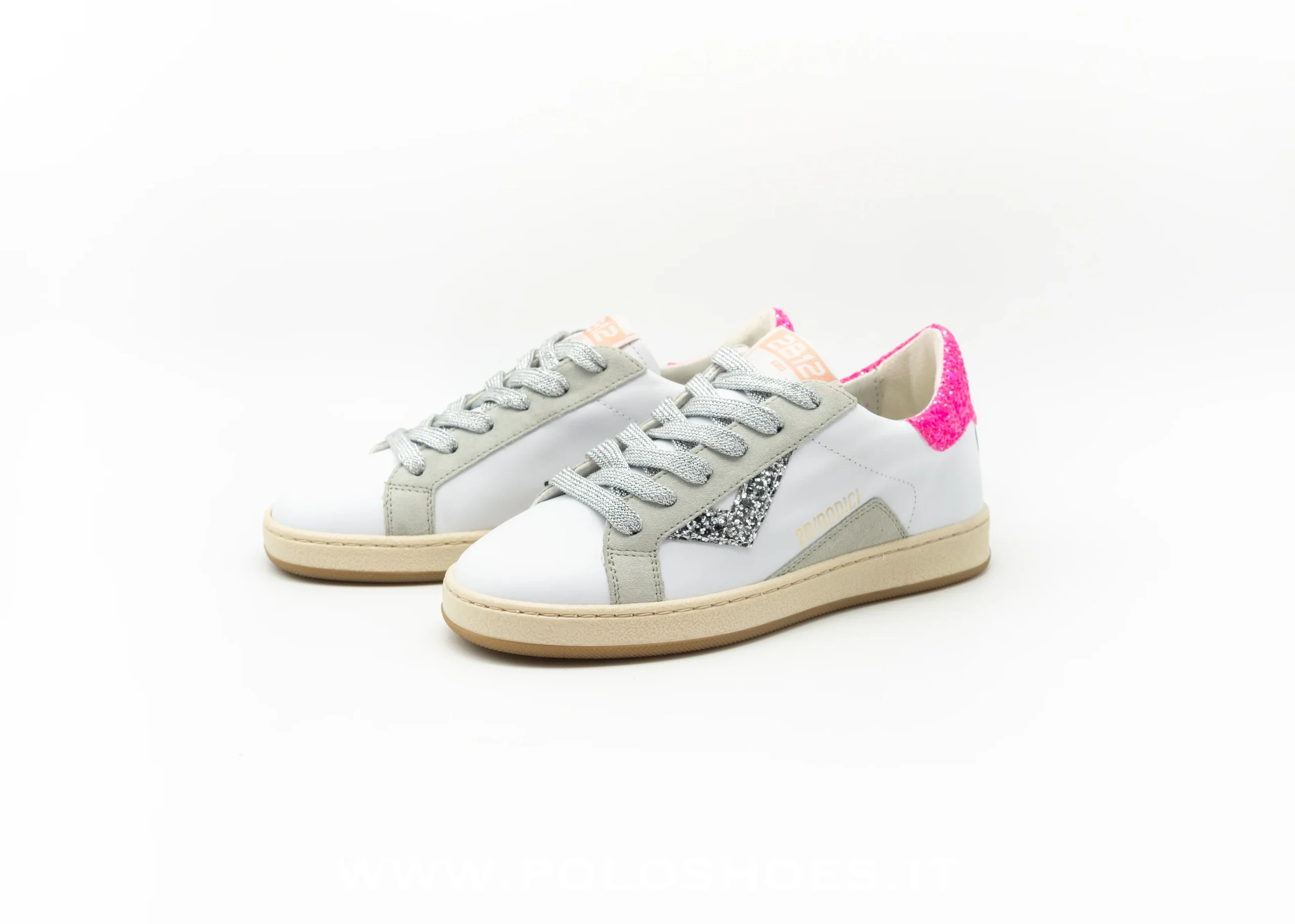 Sneakers in pelle bianca con inserti a contrasto in pelle camoscio e glitter , regolazione con laccio, suola in gomma antiscivolo MADE IN ITALY