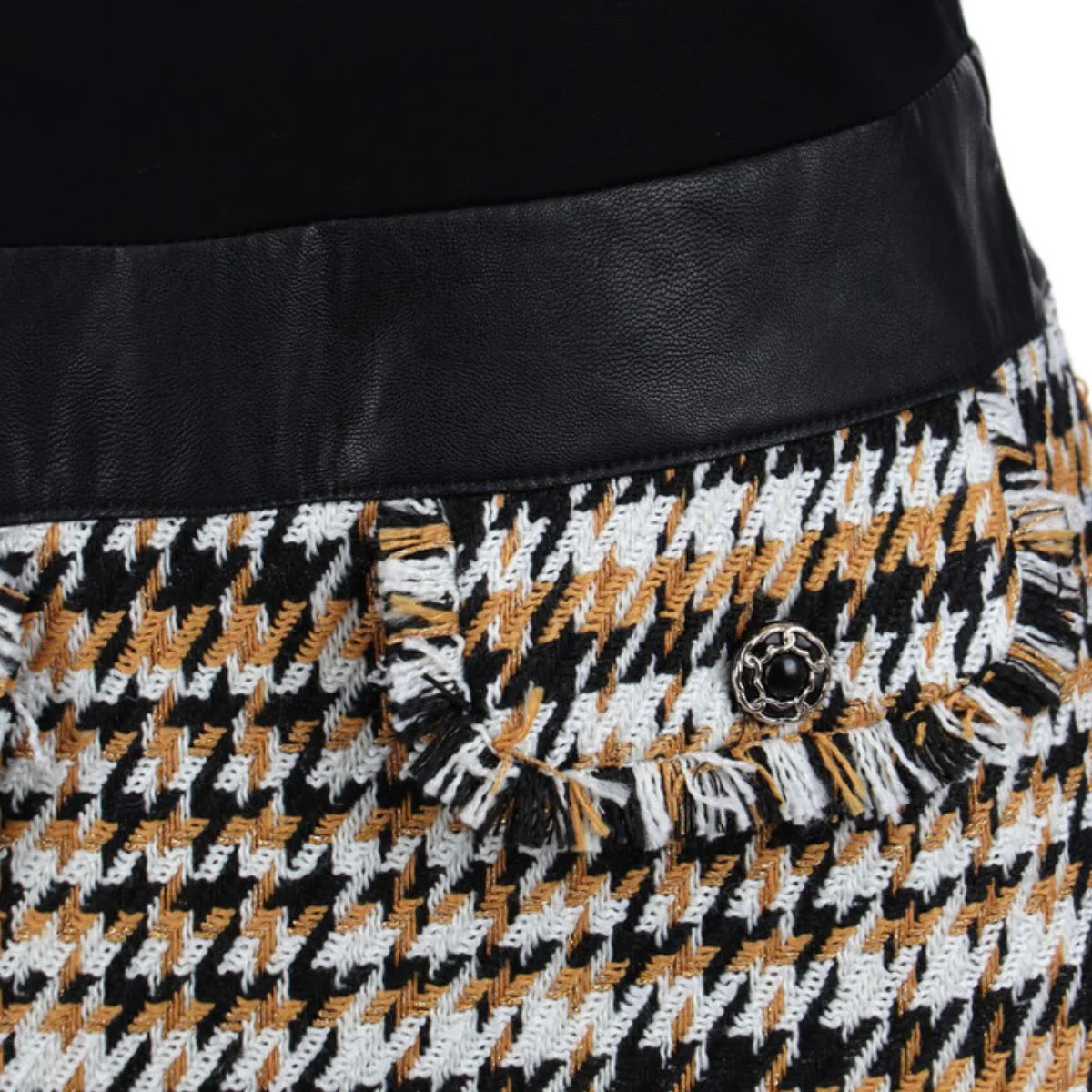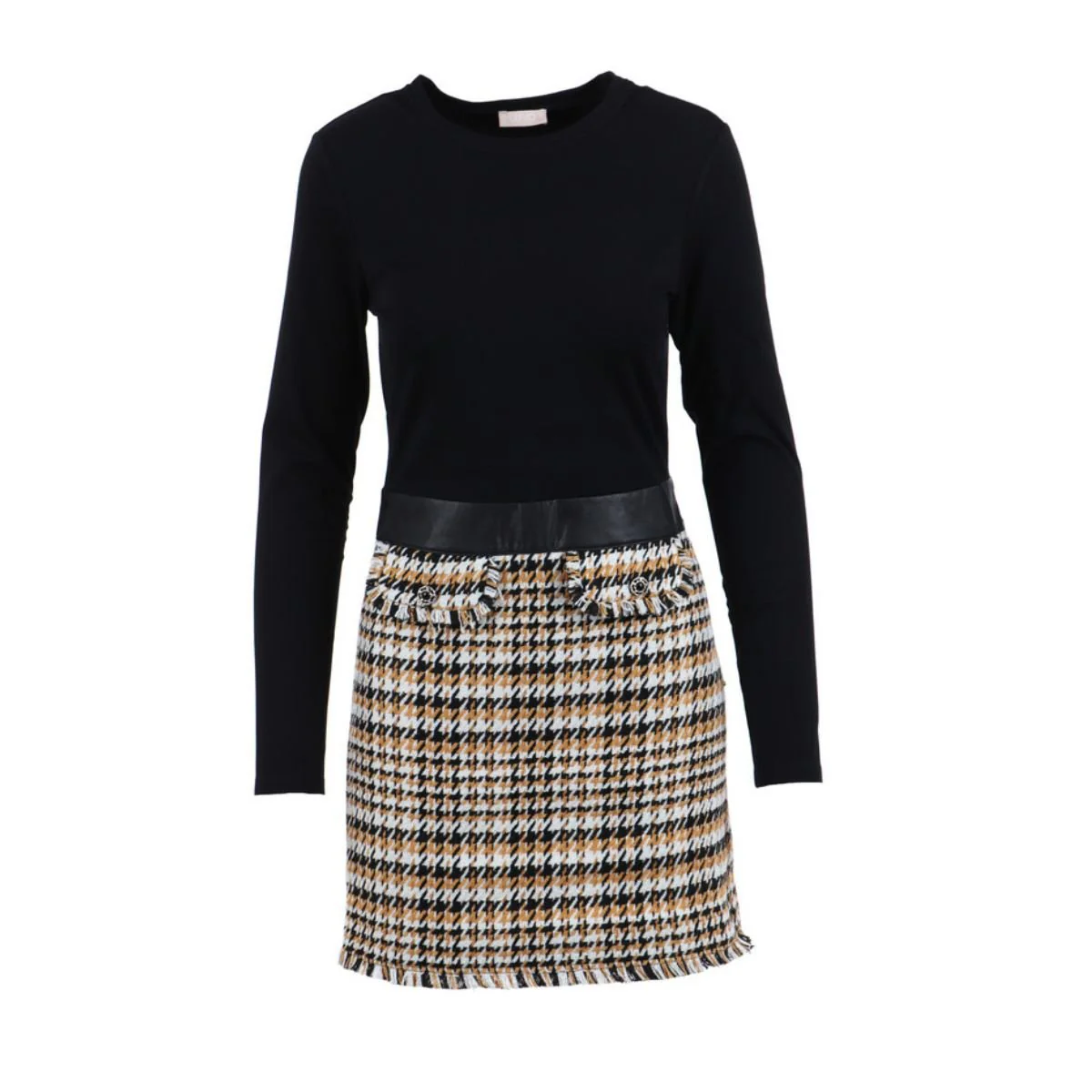 Abito da donna firmato Liu Jo realizzato con gonna in pelle e gonna a fantasia pied de poule. Un abito dallo stile casual con gonna bouclè con orlo sfrangiato dalla vestibilità slim. Completa il look con una pochette e un paio di stivaletti in pelle. Dettagli Composizione: 96% Poliestere 4% Metallo Vestibilità: Slim-fit Foderato Girocollo Fascia in vita in pelle Gonna bouclè con orlo sfrangiato Abito corto bimateriale Cod. WF2197T4226