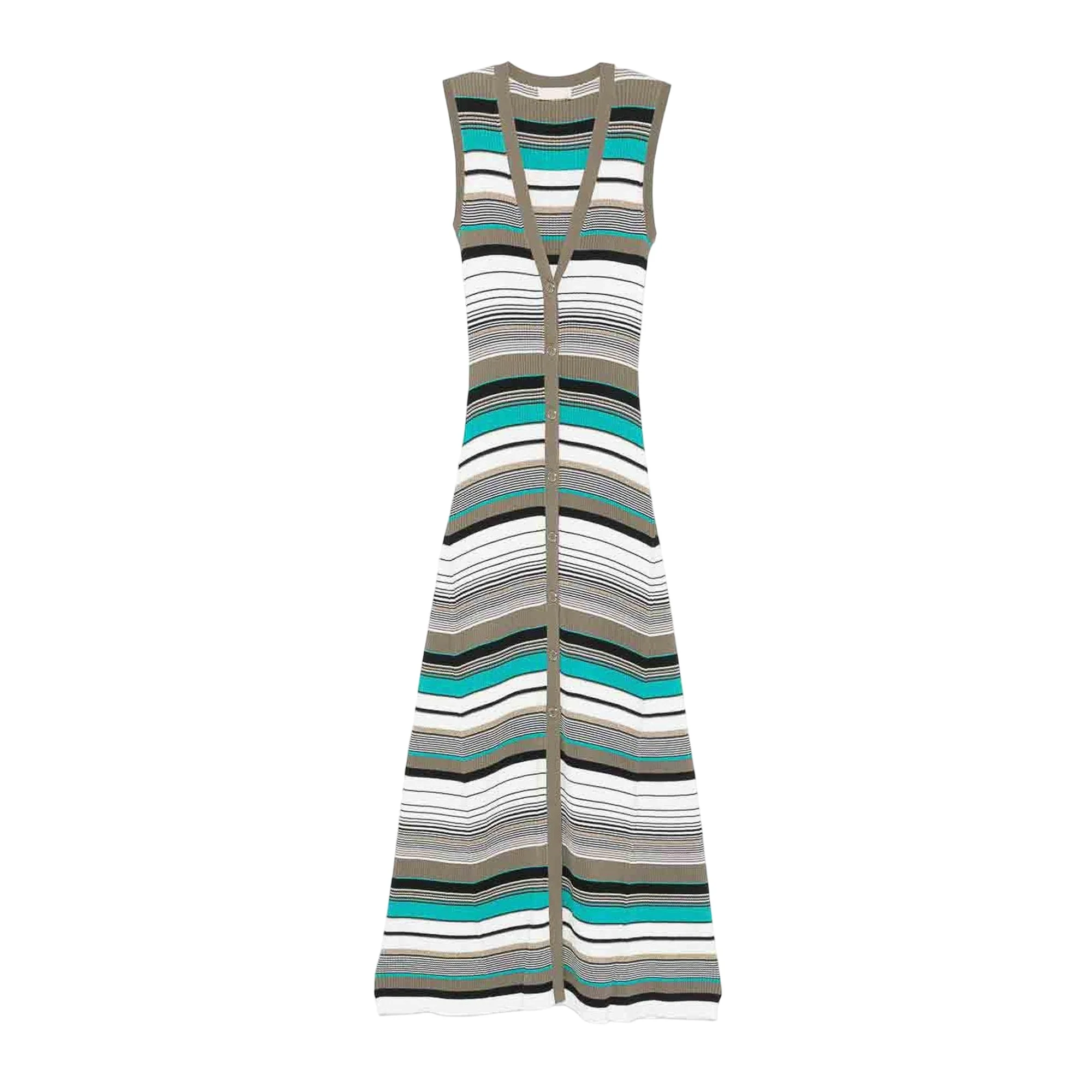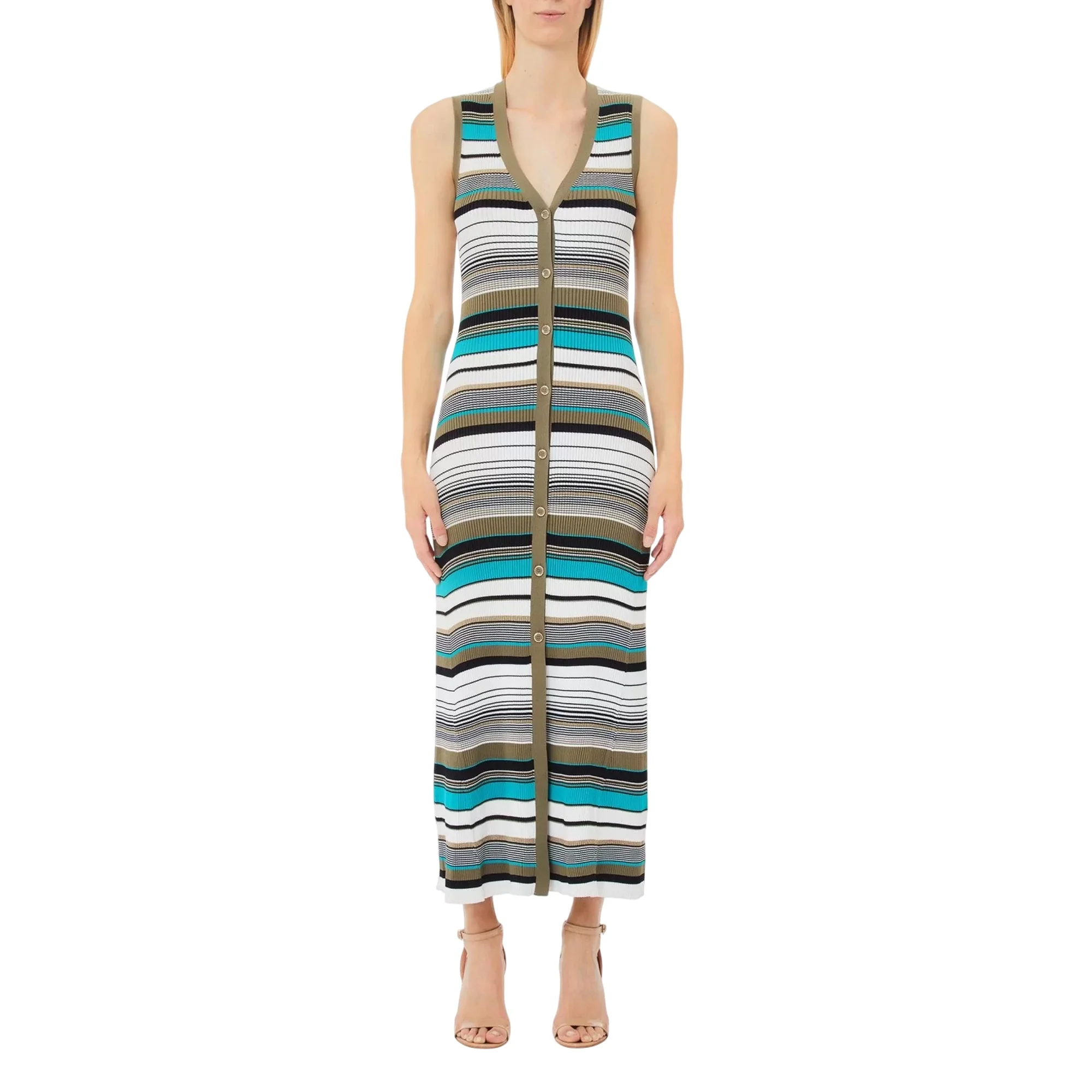 Lasciati conquistare dall’eleganza e dalla modernità di questo Abito in maglia lungo firmato Liu Jo. Con dettagli a righe multicolor e lurex, spalline larghe e uno scollo a V, è perfetto per ogni occasione. Non passare inosservata con il lettering LJ in metallo con strass sul retro e la chiusura con bottoni.