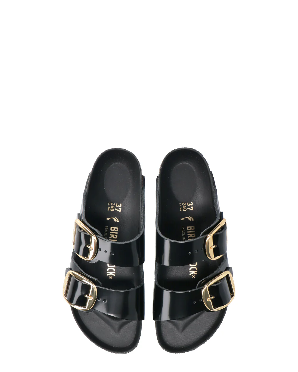 Plantare anatomico in sughero e lattice, semi-exquisit Tomaia: pelle naturale con finitura laccata Sottopiede: pelle piumato Suola: EVA Dettagli: due cinturini con grandi fibbie ad ardiglione in metallo regolabili individualmente; dettagli in colore coordinato ”Made in Germany” CALZATA STRETTA