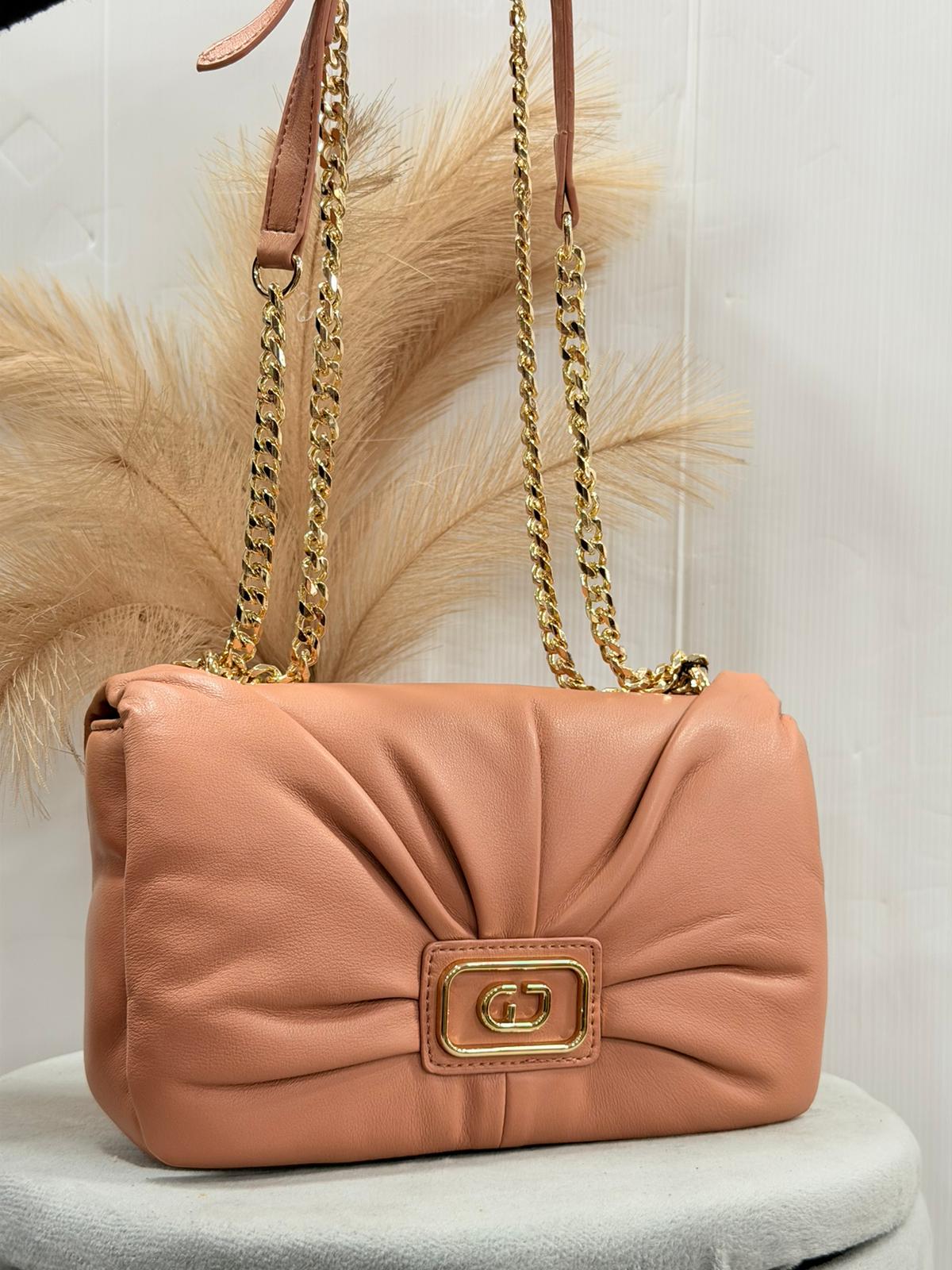 Scegli la borsa a spalla in morbida similpelle con logo GJ e tracolla con catena. Per un look contemporaneo che combina femminilità e carattere. L 23 x H 15 x W 5