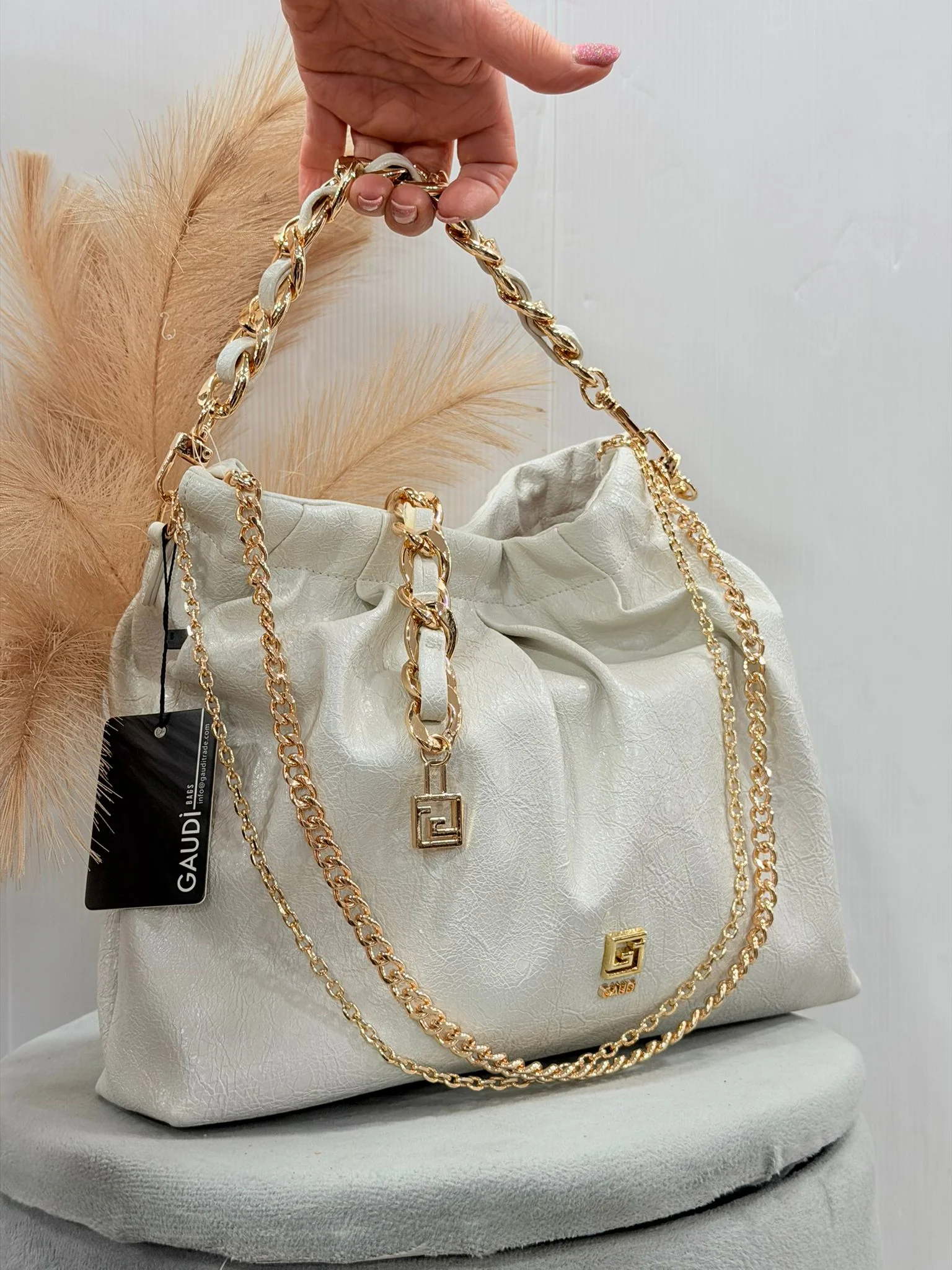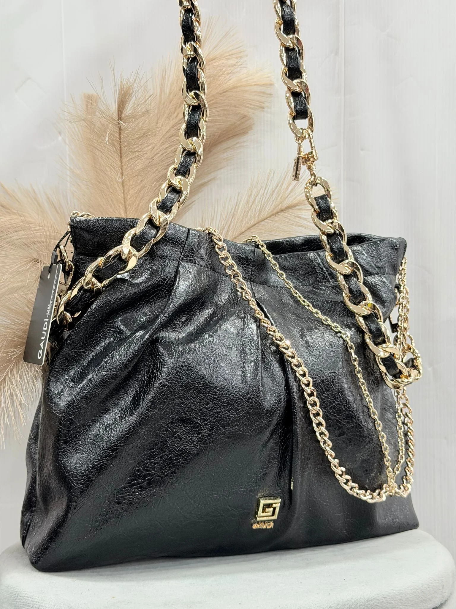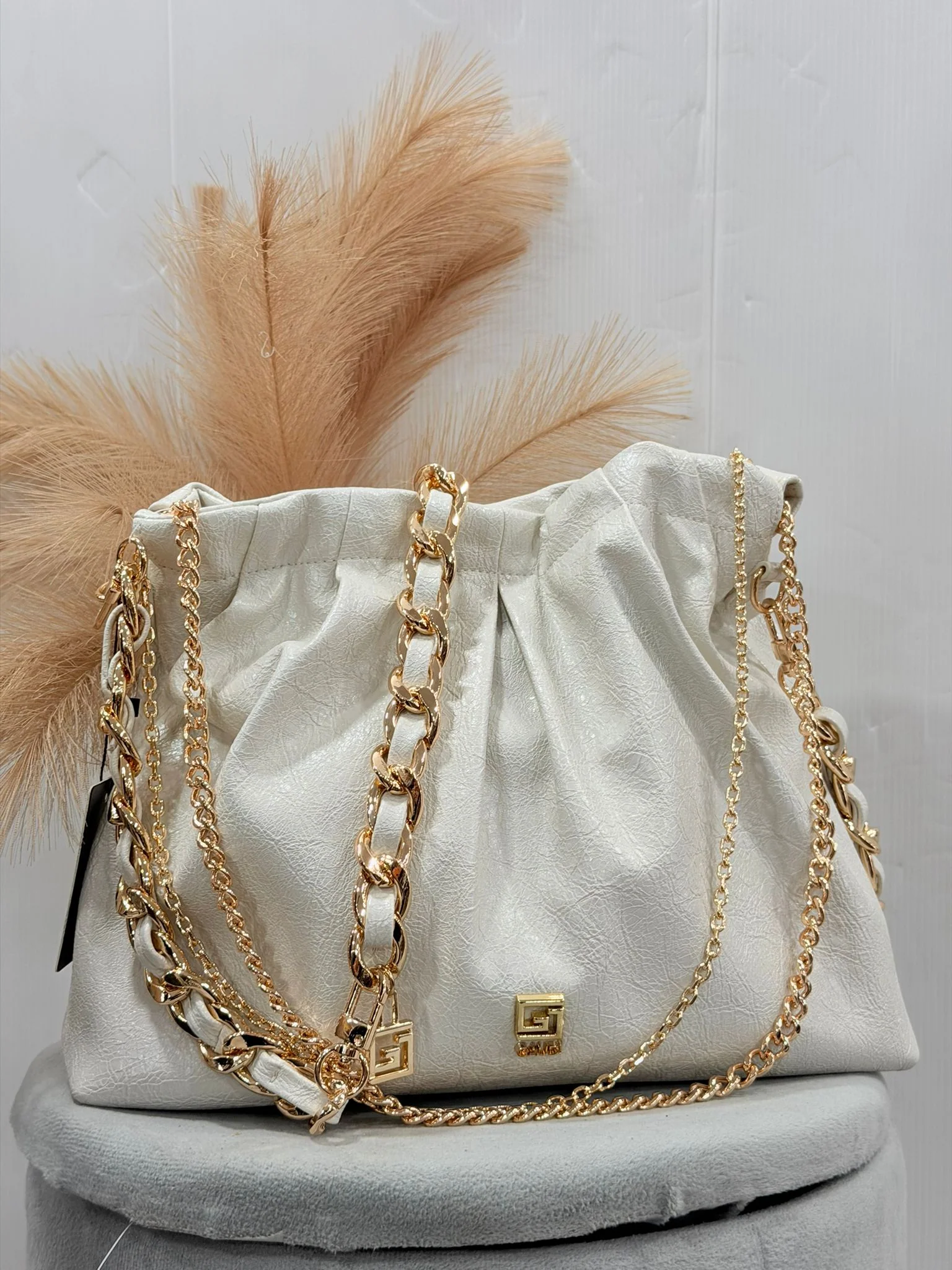 Scegli la mini borsa a secchiello in similpelle con manici a catena, logo GJ e tracolla rimovibile. Un mix perfetto tra raffinatezza e personalità. L 21 x H 21 x W 6