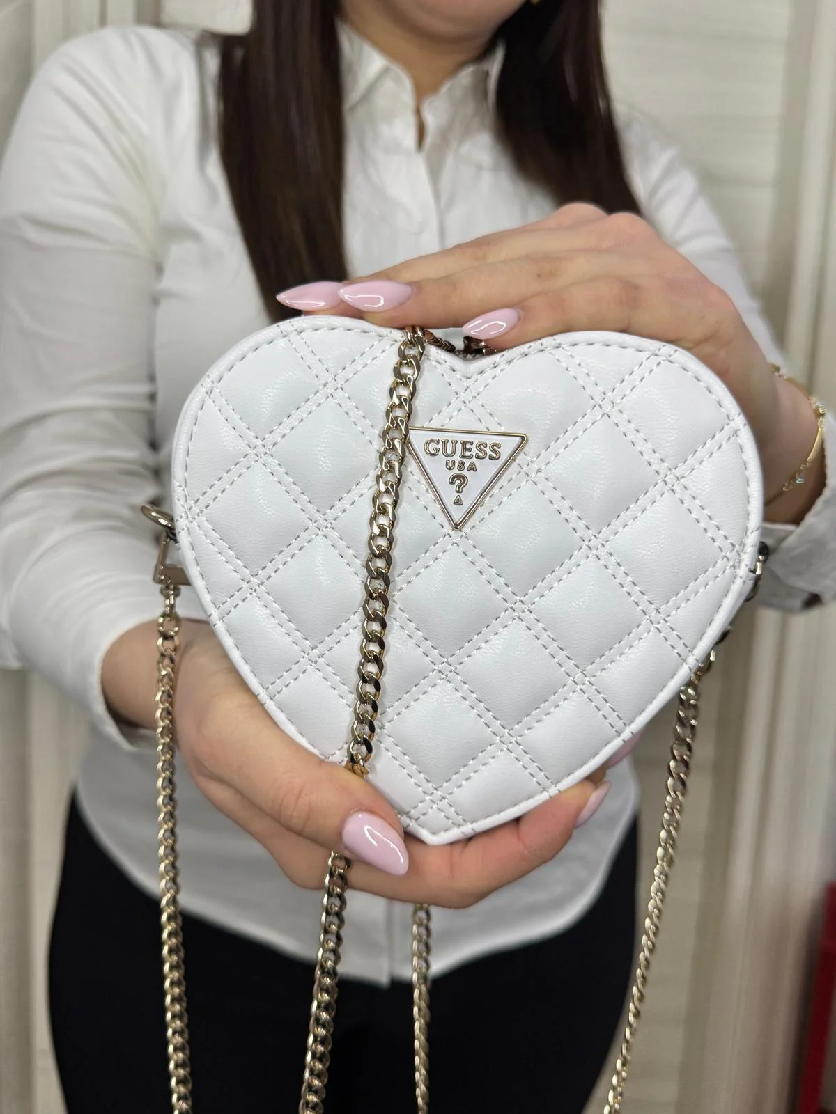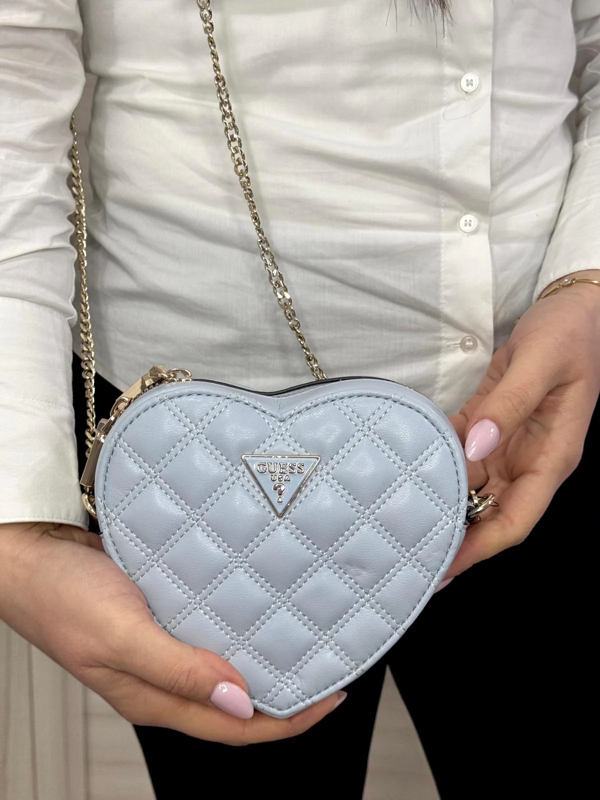 Borsa Guess chiusura con zip tracolla in catena colori: Bianca . Nera Bronzo Celeste