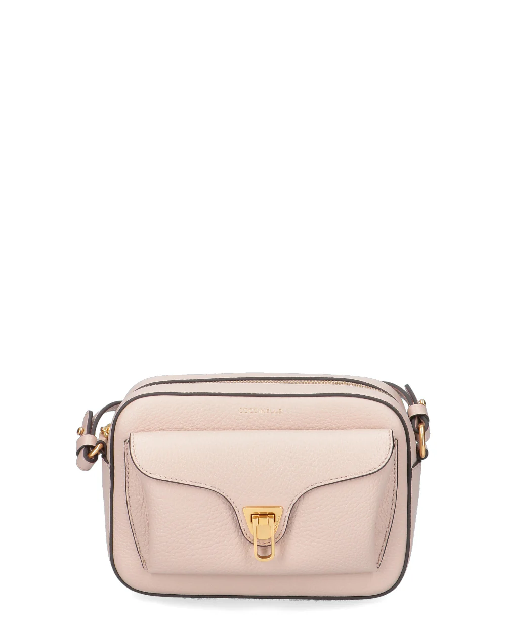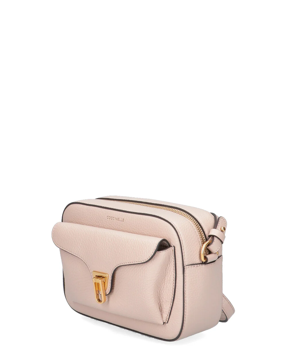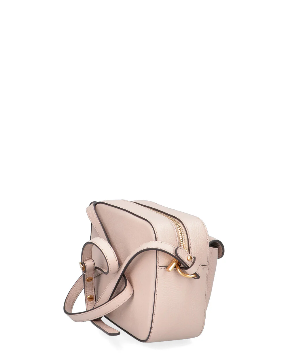 Camera bag in pelle Portabilità a tracolla Galvanica Old Gold Interno in tessuto Tasca interna chiusa con zip Chiusura iconica a forma di Plettro Logo timbro oro Targhetta interna in pelle rosa Misura 21*15*7 cm