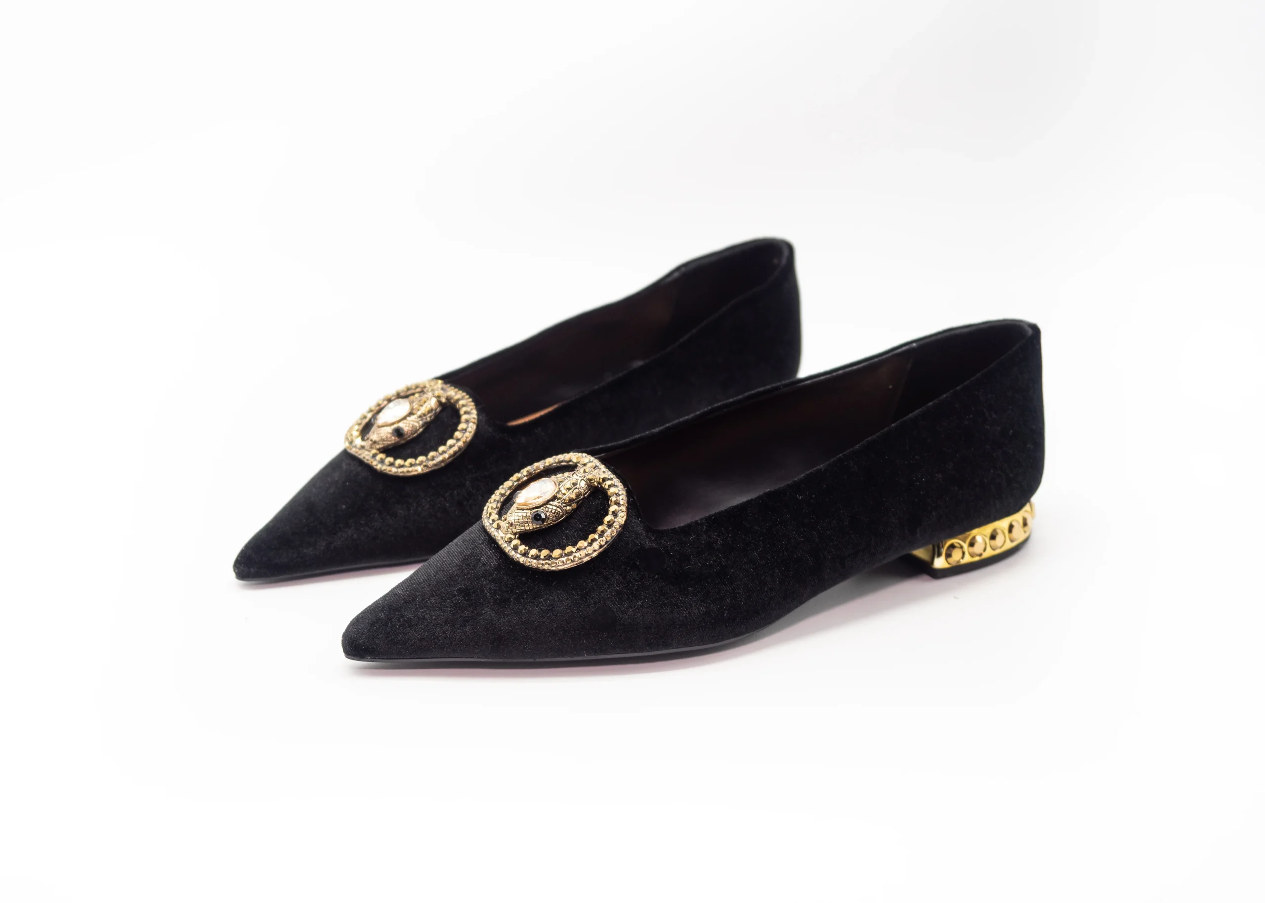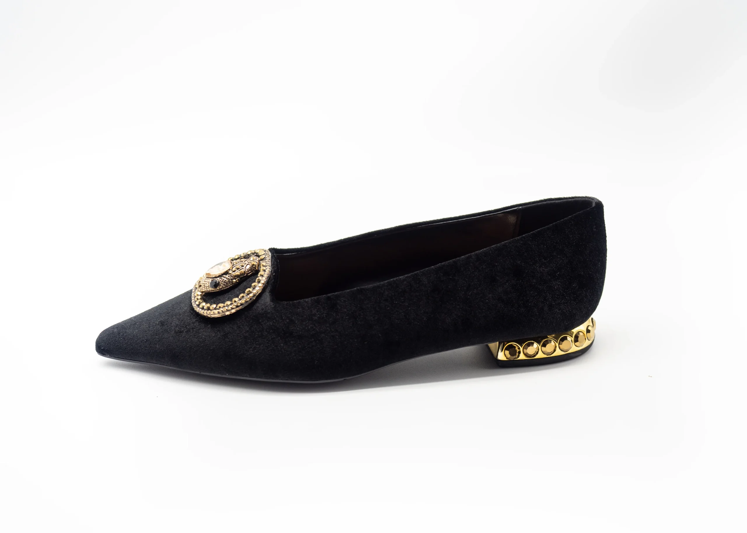 Ballerina in velluto nero ,accessorio rappresentante una testa di serpente con pietre incastonate , sottopiede in vera pelle , tacco 1,5cm rivestito di “brillanti” oro, suola in gomma