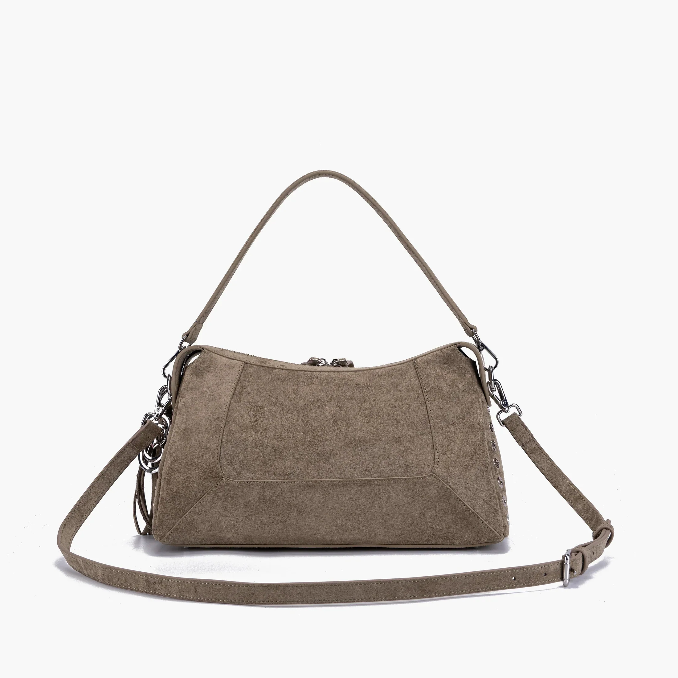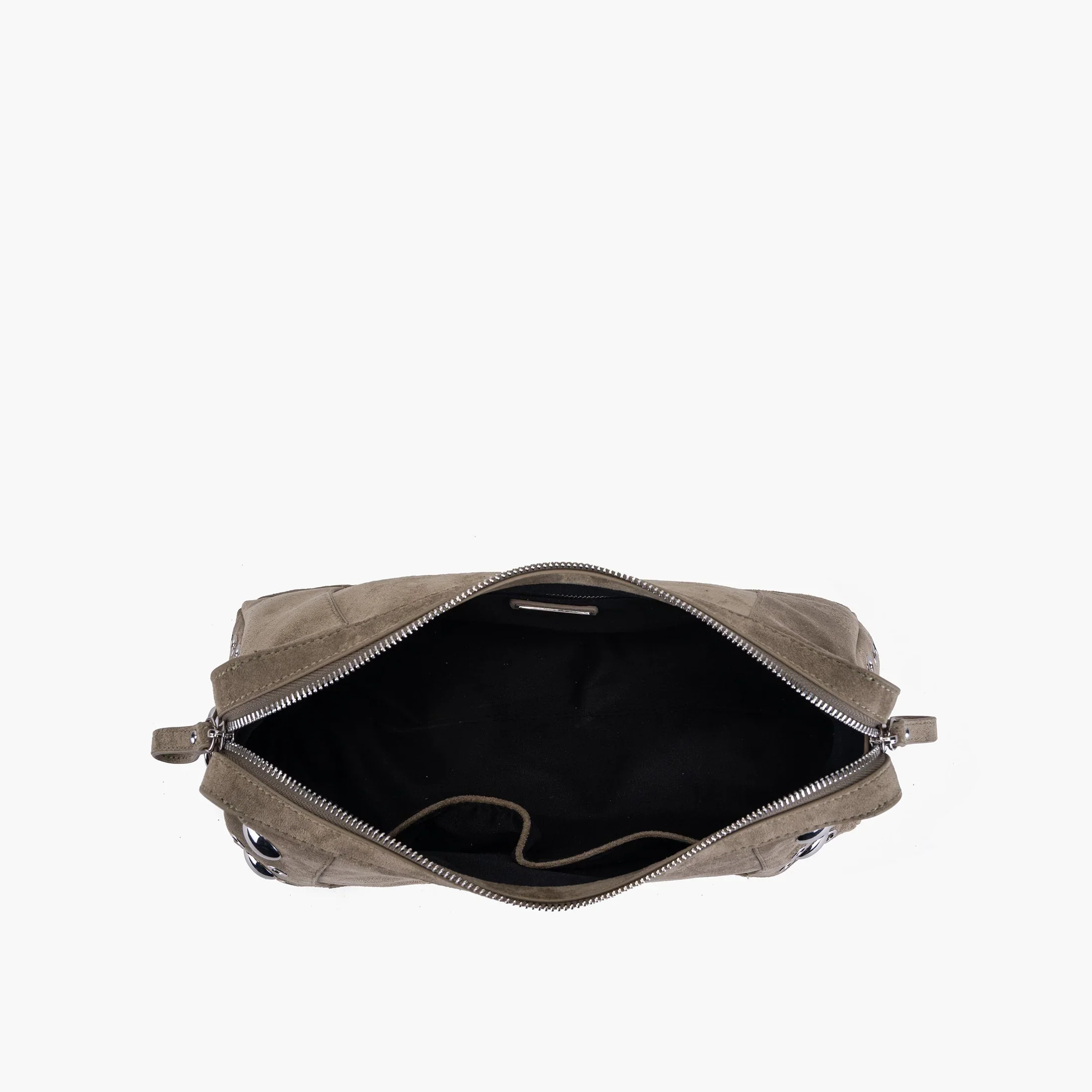 Borsa a spalla in suede con occhielli e borchie in argento, manico e tracolla rimovibili