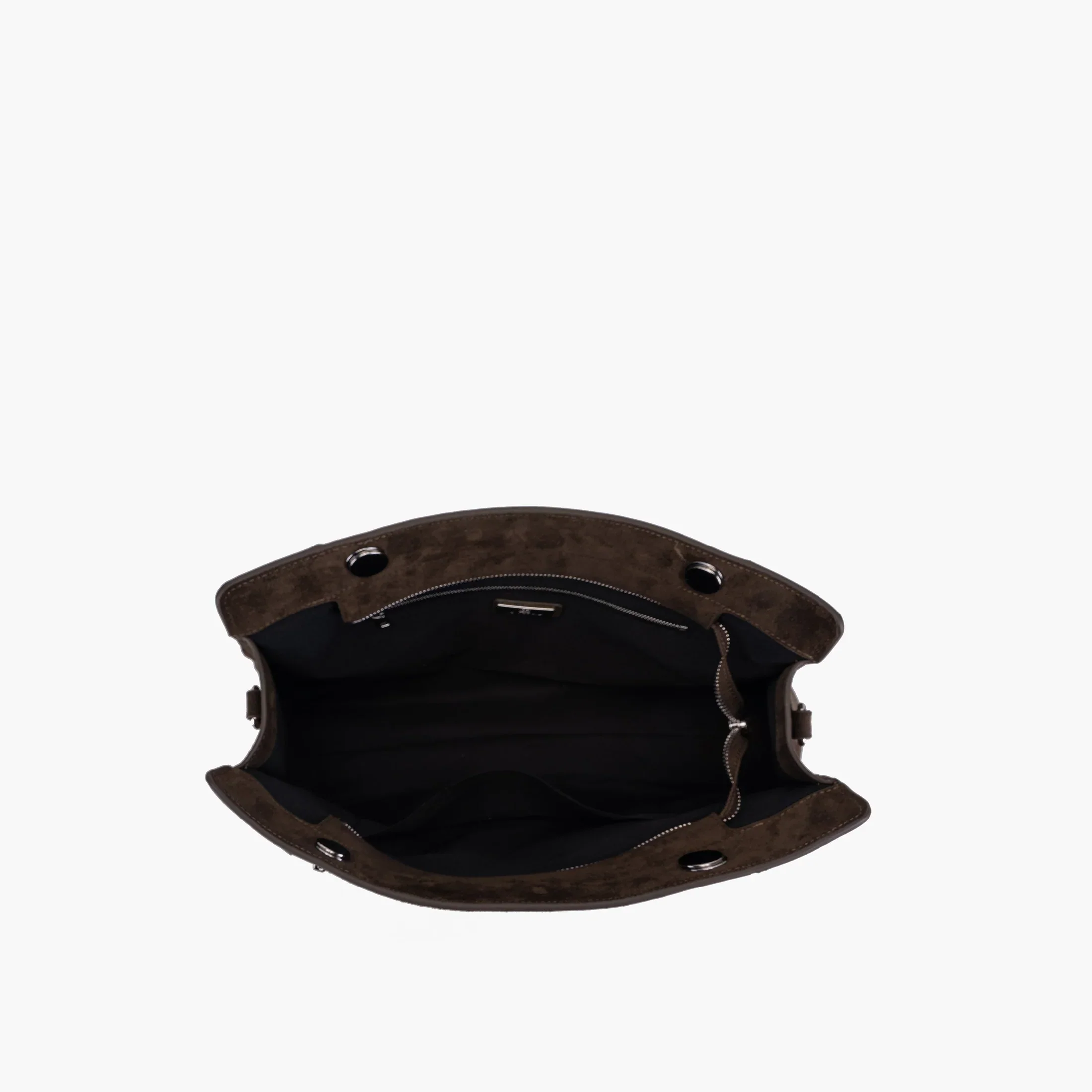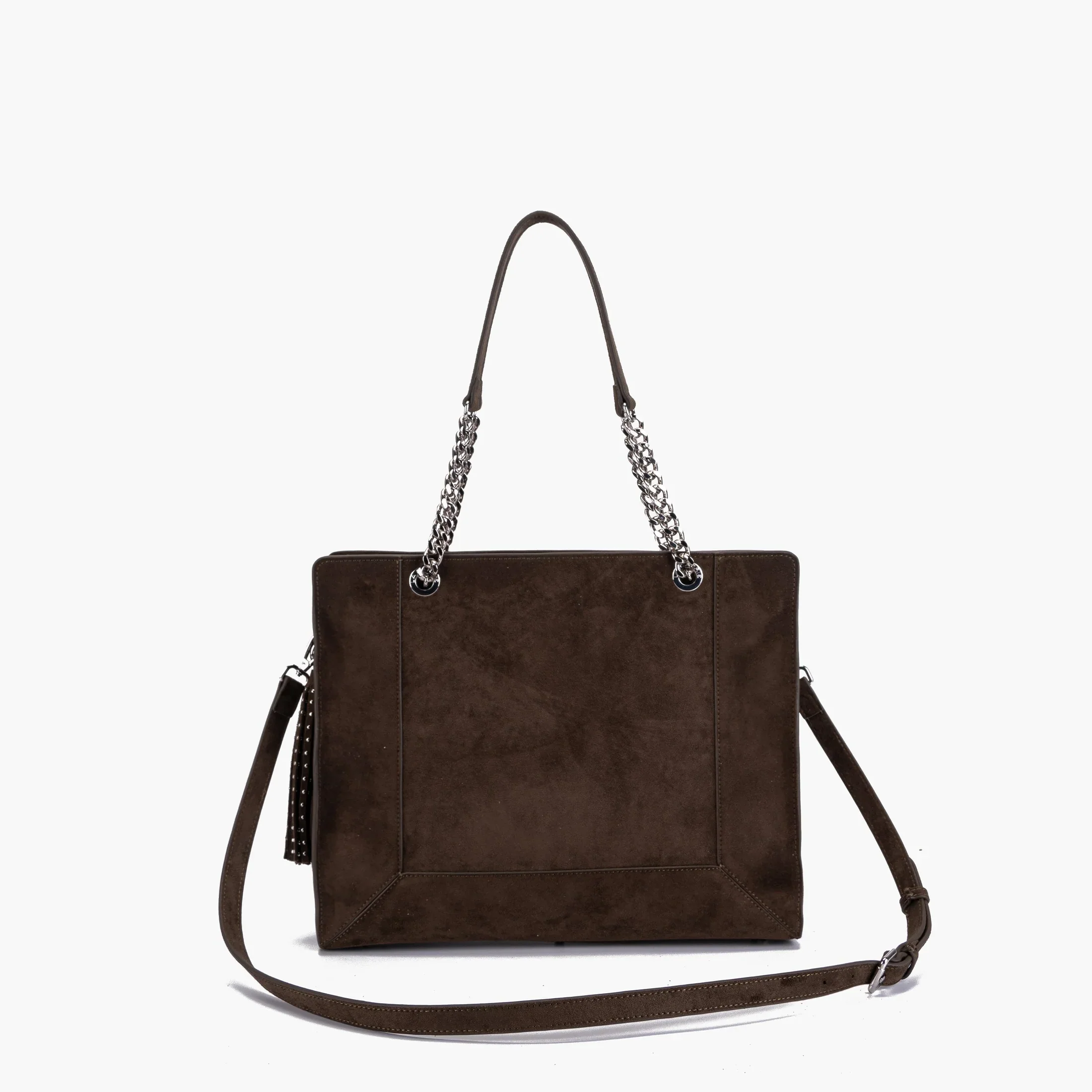 Borsa shopping in suede con occhielli e borchie in argento, doppi manici in catena e tracolla rimovibile