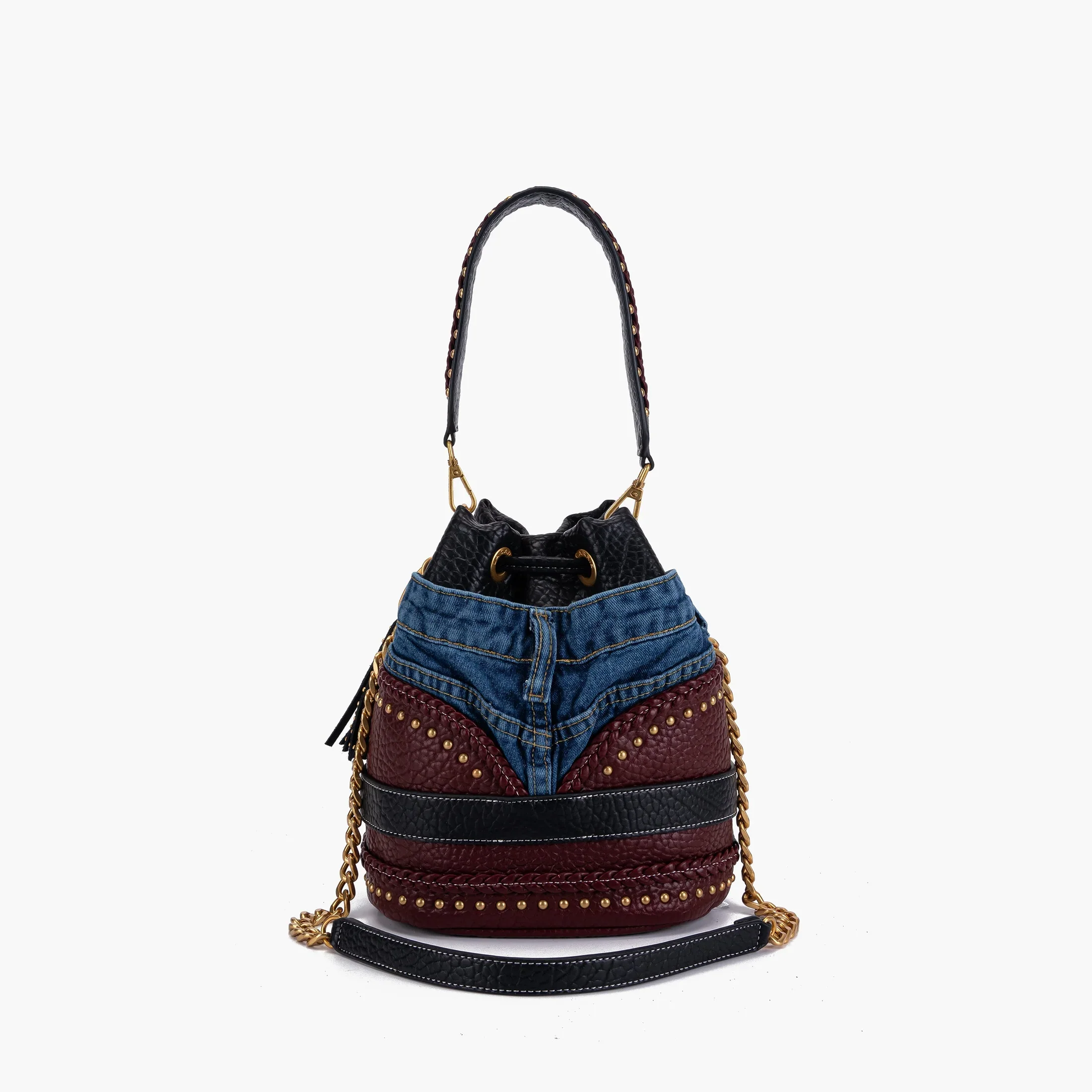 Secchiello multi materiale in jeans ed ecopelle martellata, con borchie dorate e manico e tracolla rimovibile