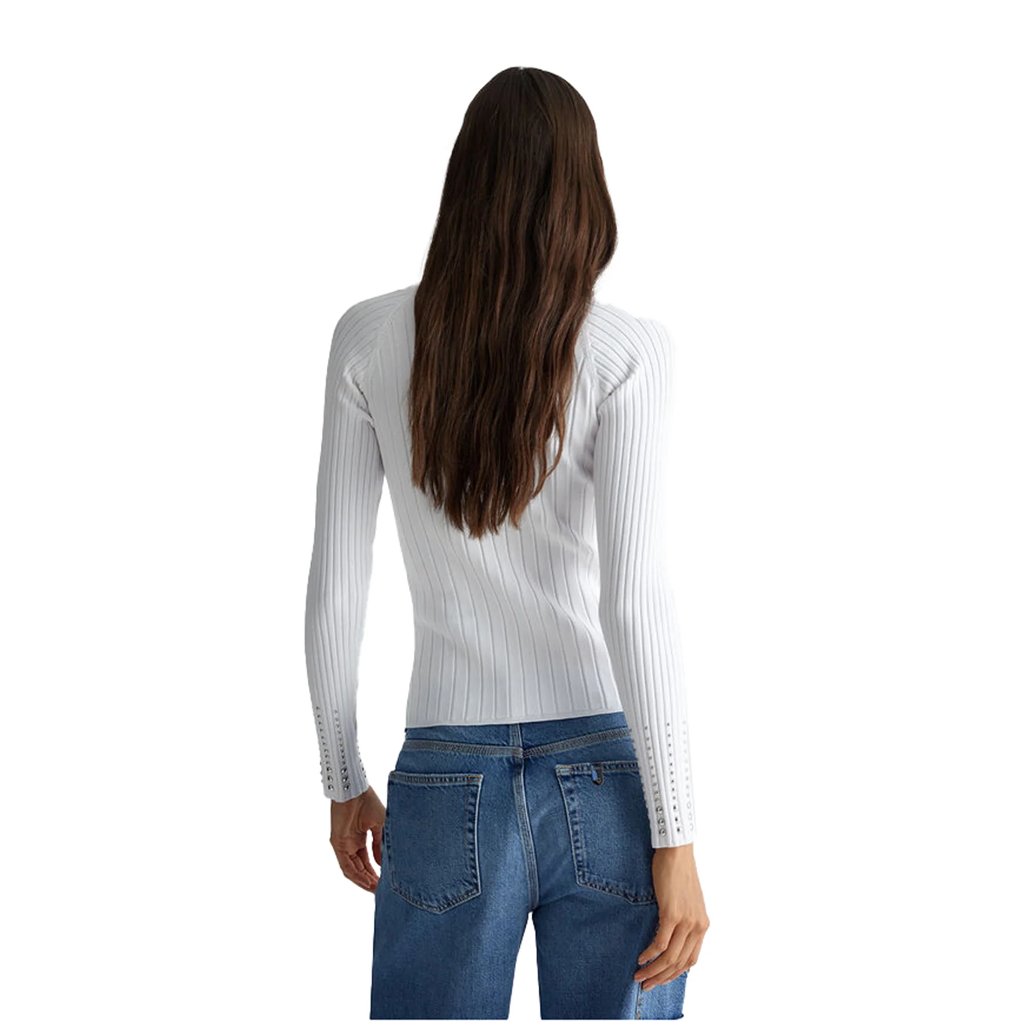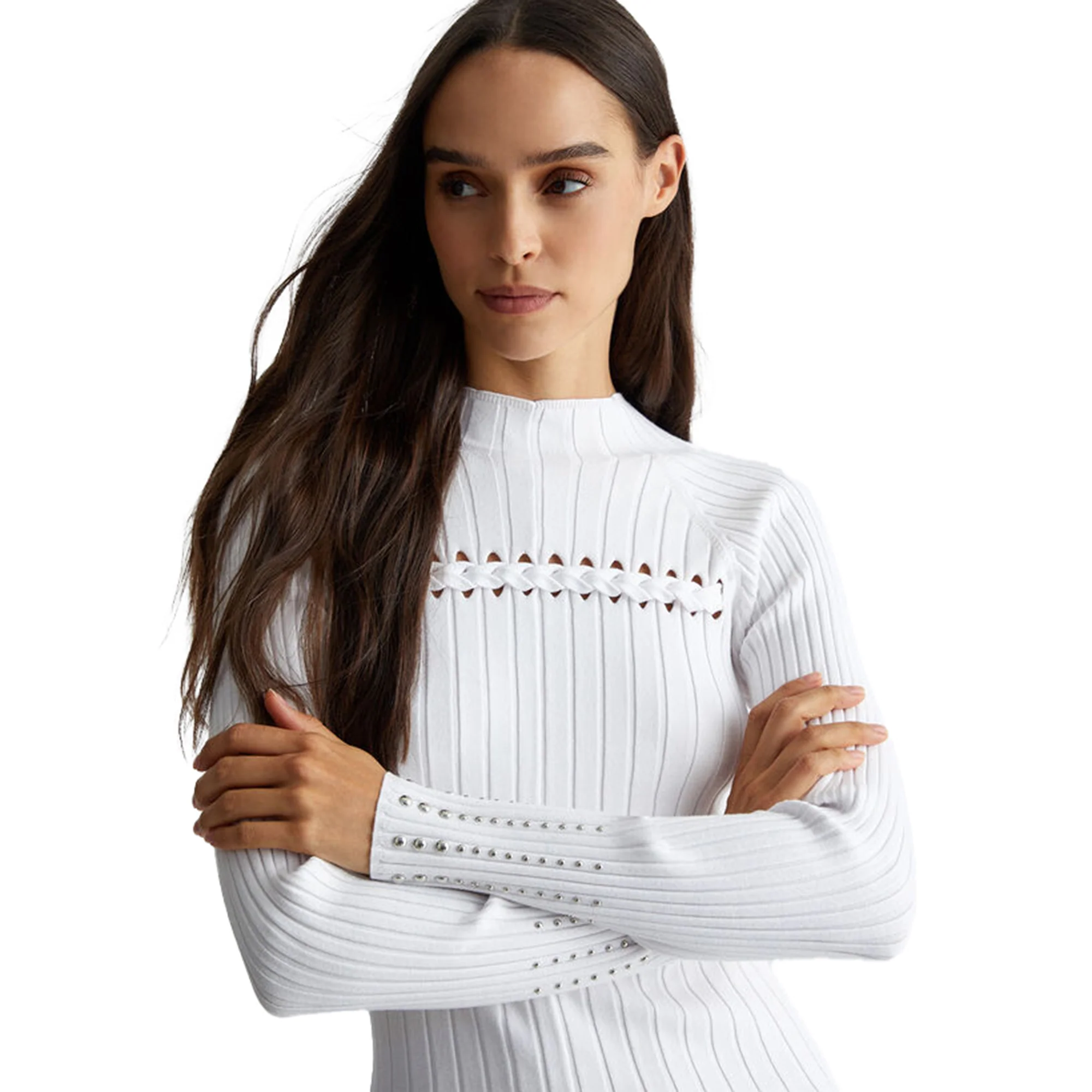 Aggiungi un tocco di raffinatezza al tuo look con questa Maglia da donna bianca di Liu Jo. La vestibilità slim fit e la lavorazione a coste la rendono comoda da indossare, mentre le borchie applicate e il motivo treccia la rendono unica e alla moda. Ideale per distinguersi senza perdere stile e delicatezza.