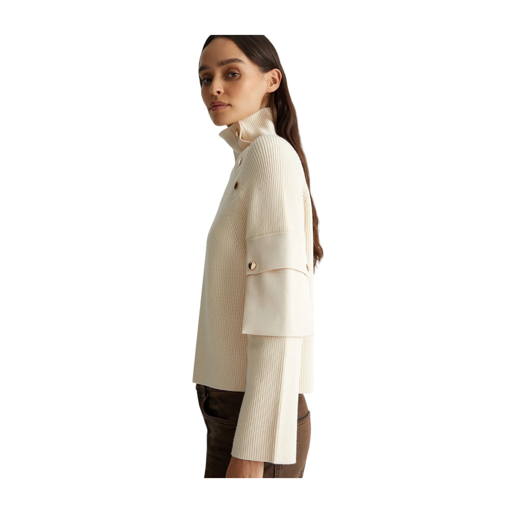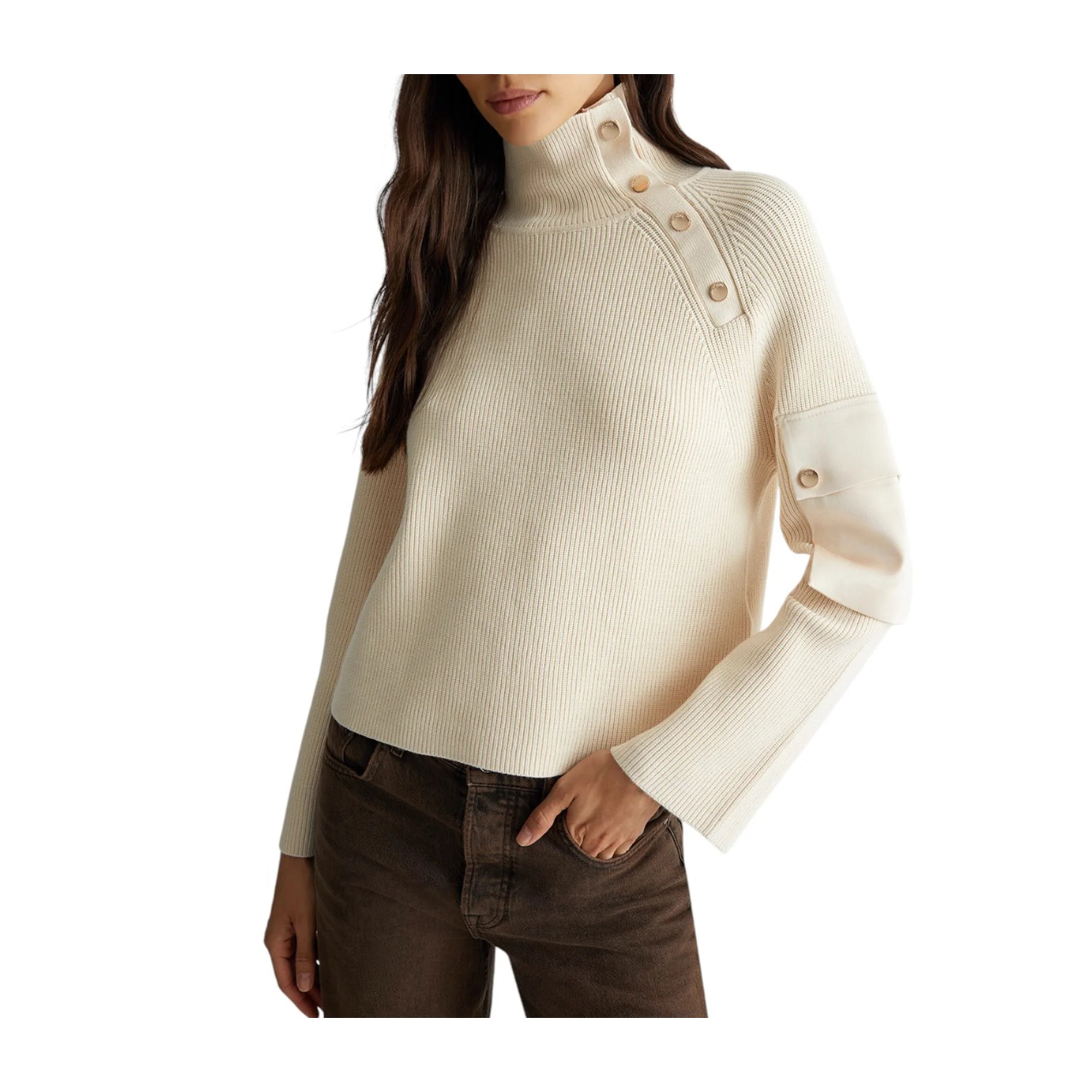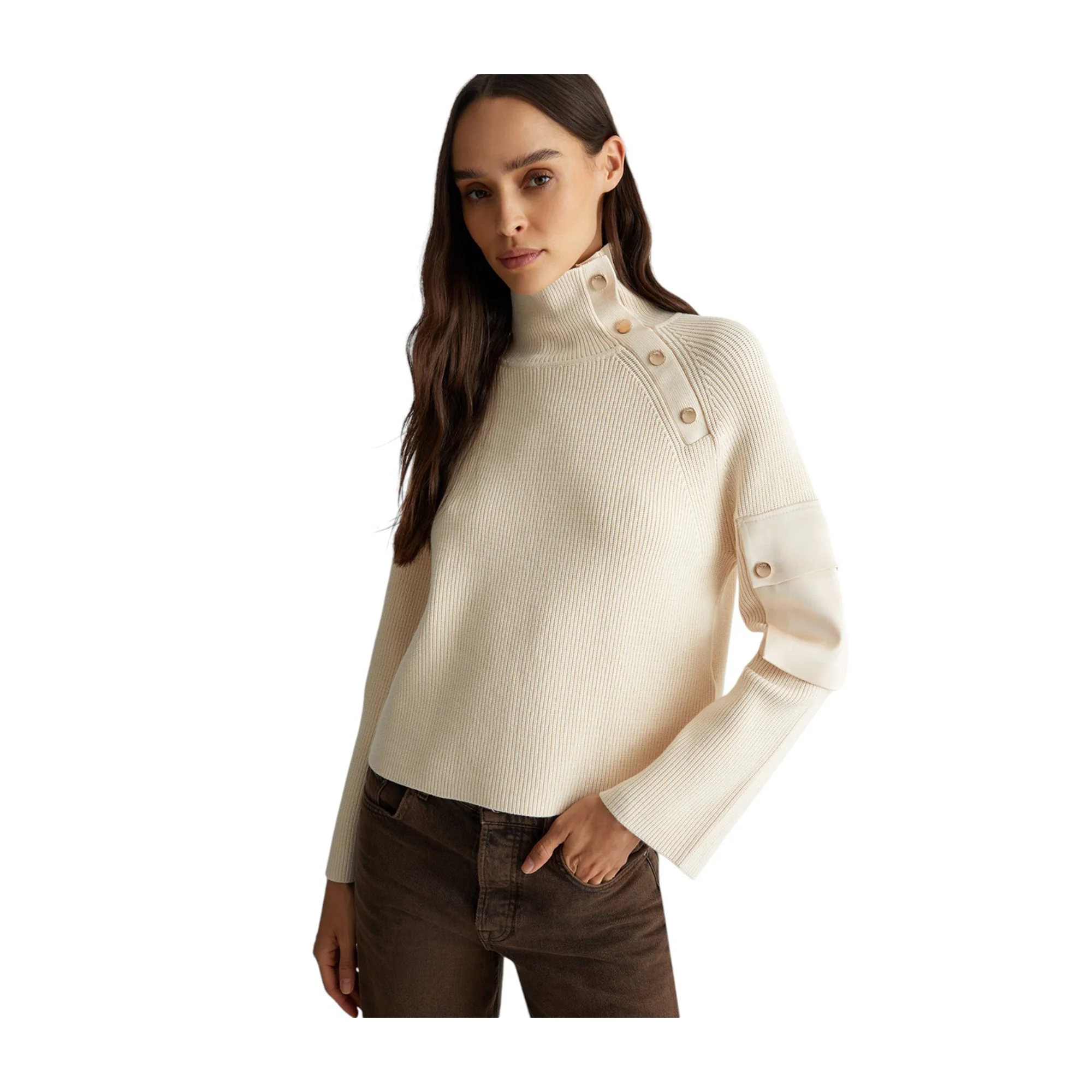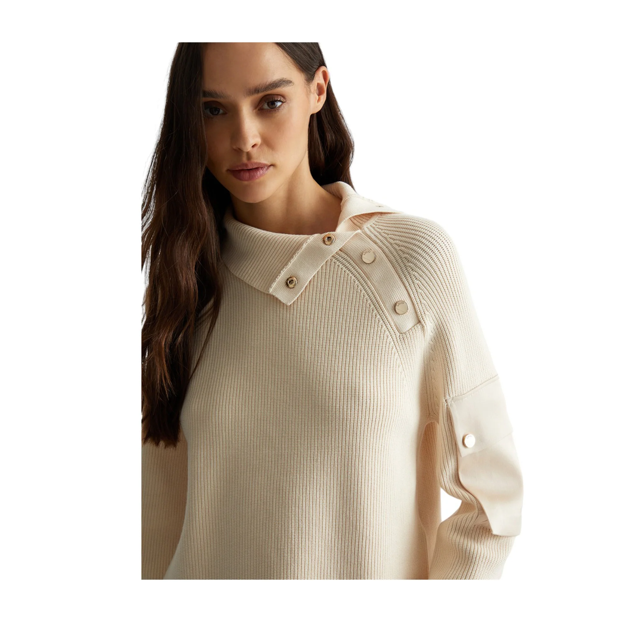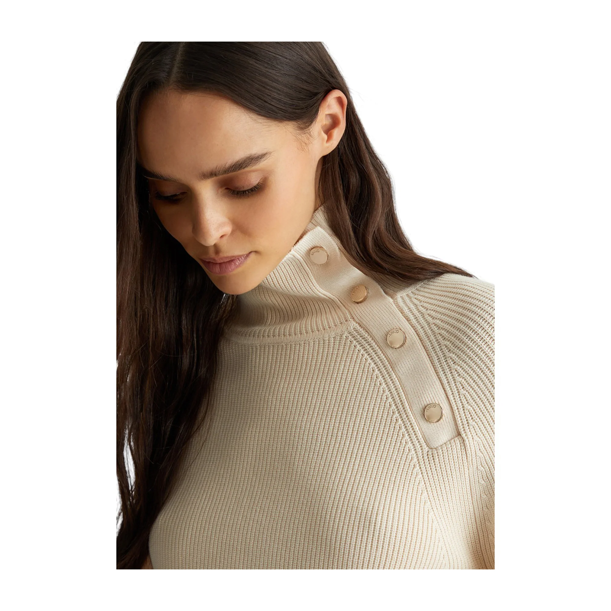 Esalta il tuo stile con questa Maglia bianca da donna firmata Liu Jo! La tinta unita conferisce una sensazione di raffinatezza, mentre la lavorazione a coste aggiunge un tocco di classe. Il collo alto e i bottoni decorativi donano un look sofisticato, mentre la tasca in nylon sulla manica garantisce comodità e praticità.