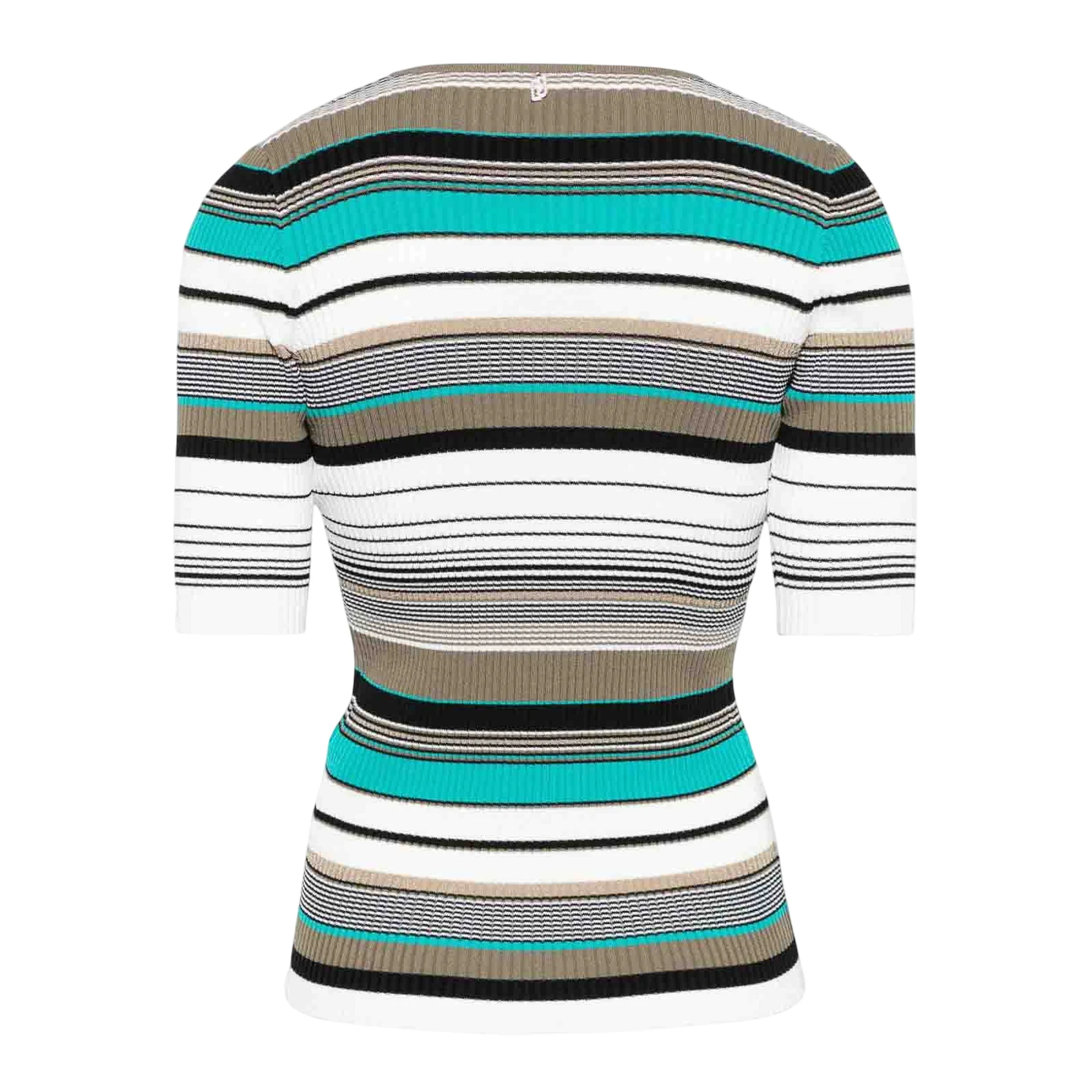 In questa Maglia donna di Liu Jo dalla vestibilità slim fit, il motivo a righe multicolor è accentuato dalla lavorazione a costine e dagli interventi in lurex. Lo scollo a V e le maniche a 3/4 offrono un tocco di femminilità, mentre il lettering LJ in metallo strass sul retro aggiunge un tocco di glamour. Non passare inosservata con questa maglia!