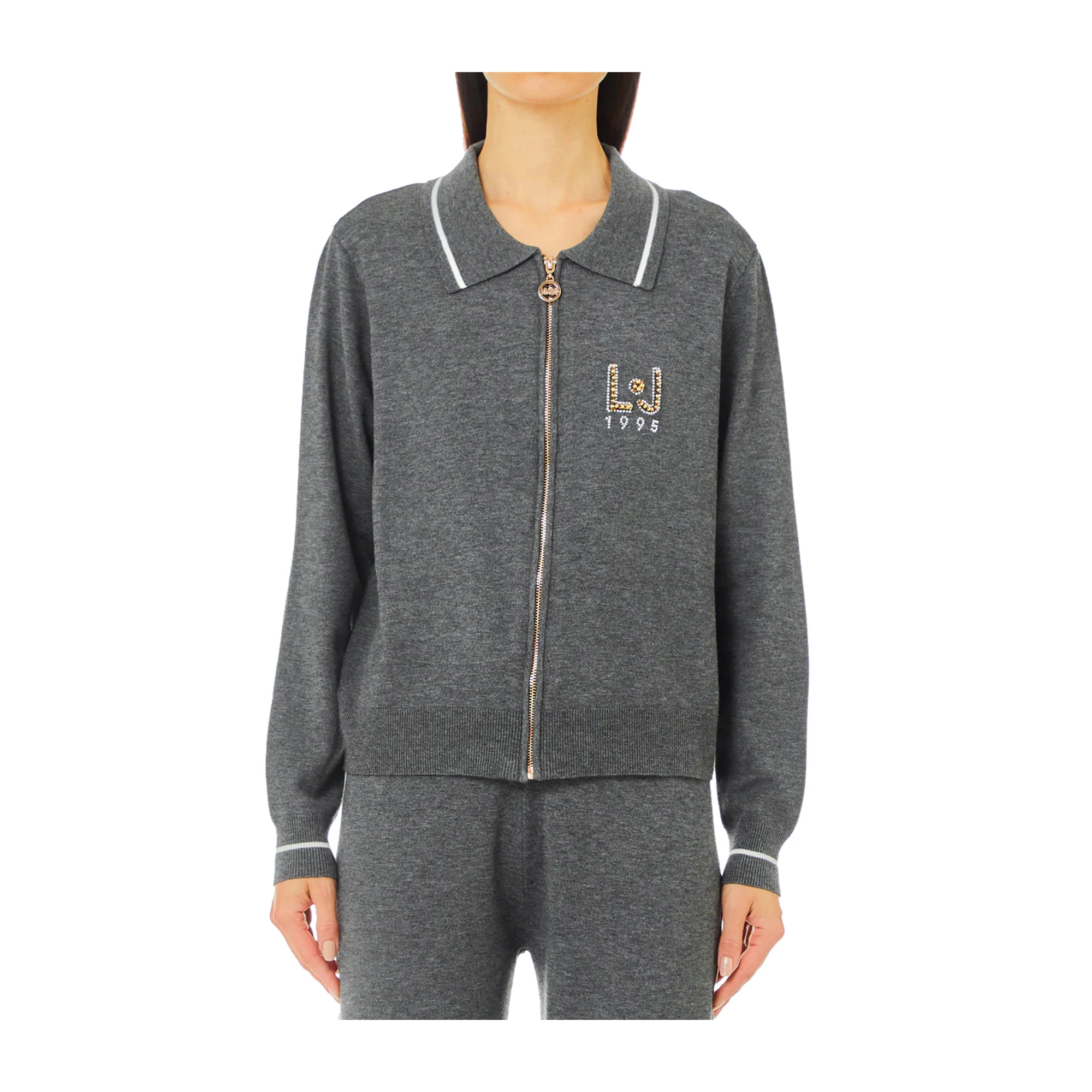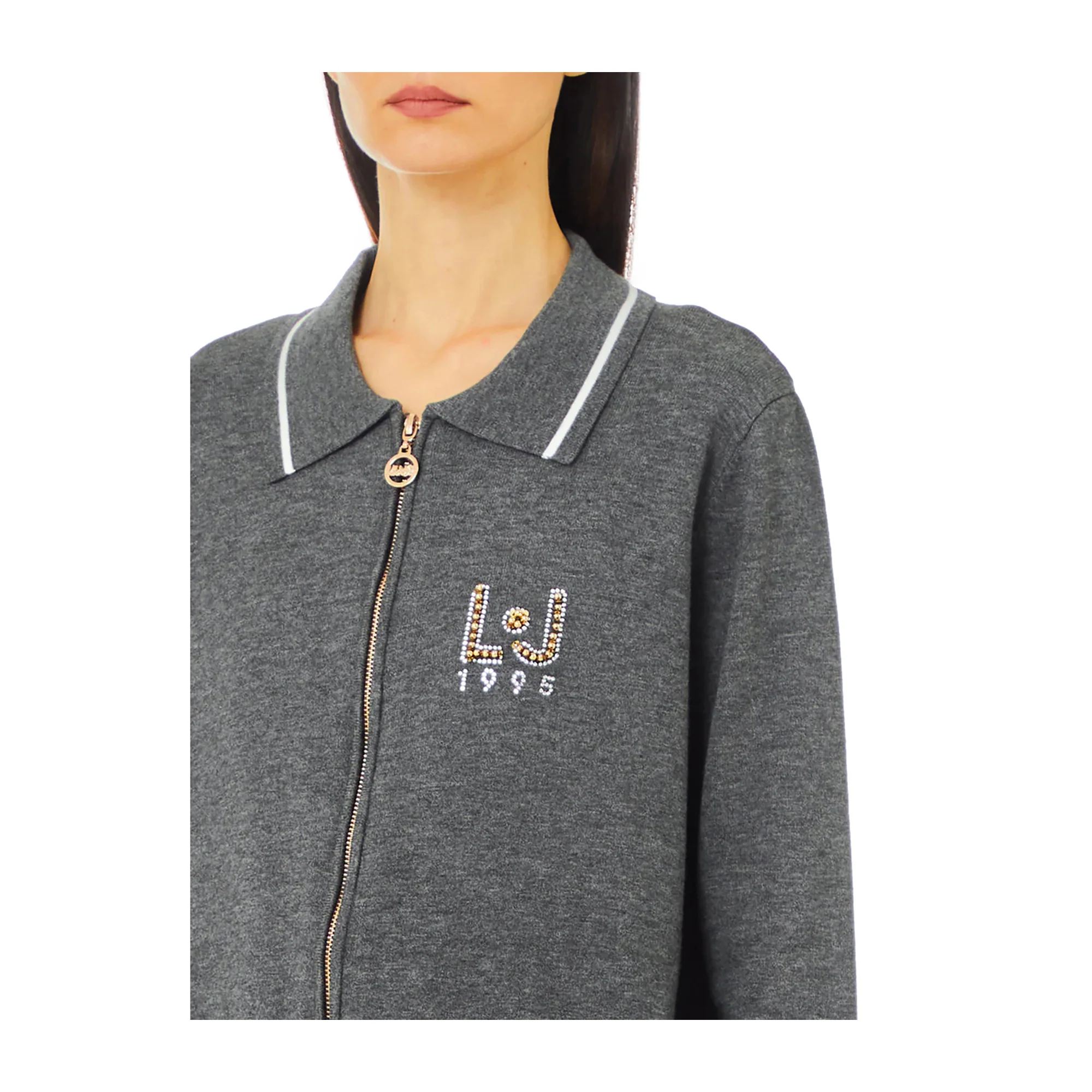 Questa Maglia Donna Grigia con apertura a zip firmata Liu Jo è perfetta per un look sportivo e alla moda. Le maniche lunghe con polsini stretti offrono calore e comfort, mentre i dettagli decorativi bianchi sul polsino e il collo aggiungono un tocco di eleganza. Il logo LJ con strass sul petto aggiunge un tocco di brillantezza e stile.