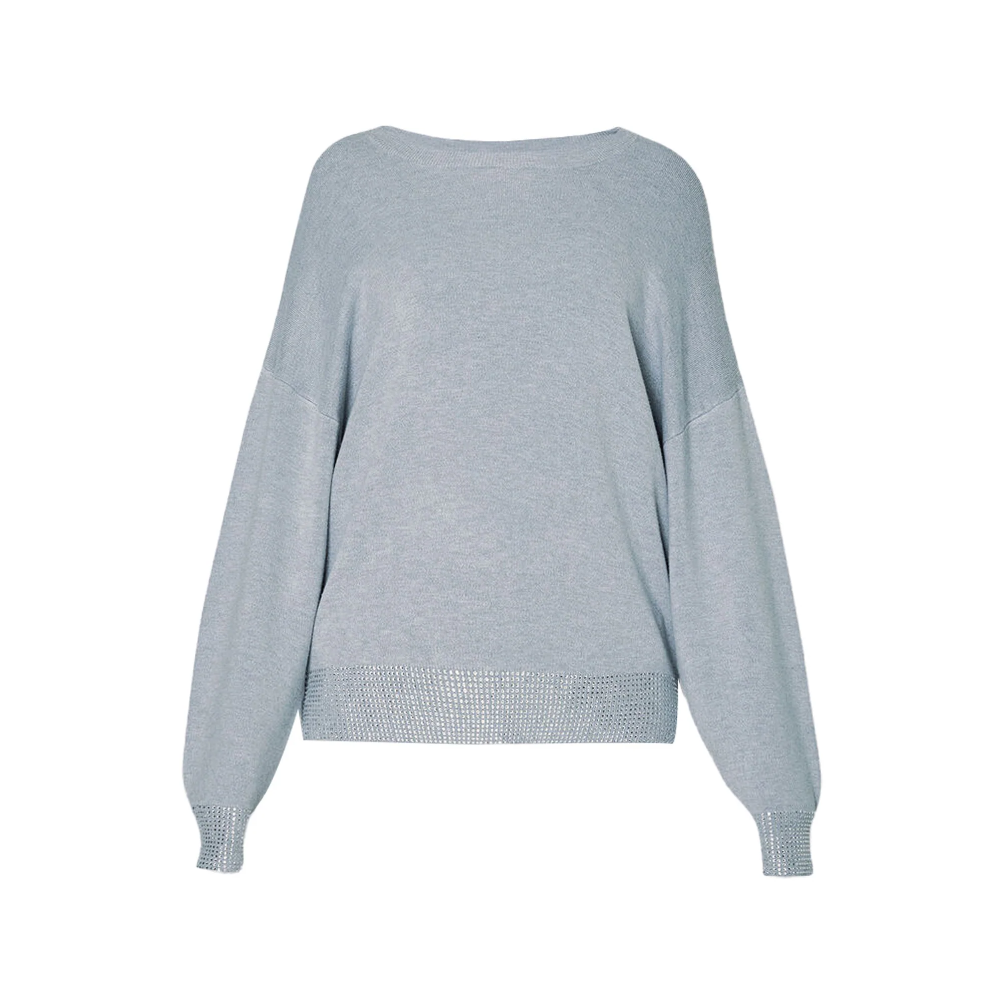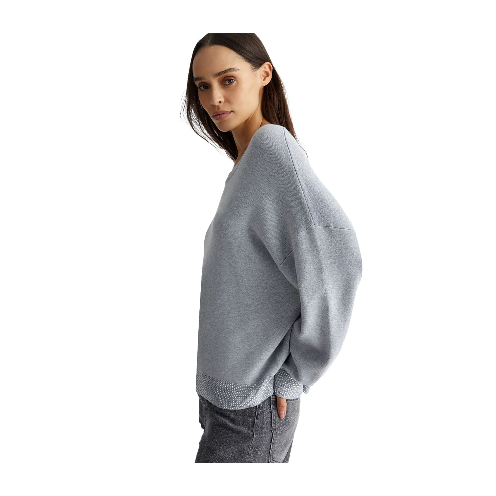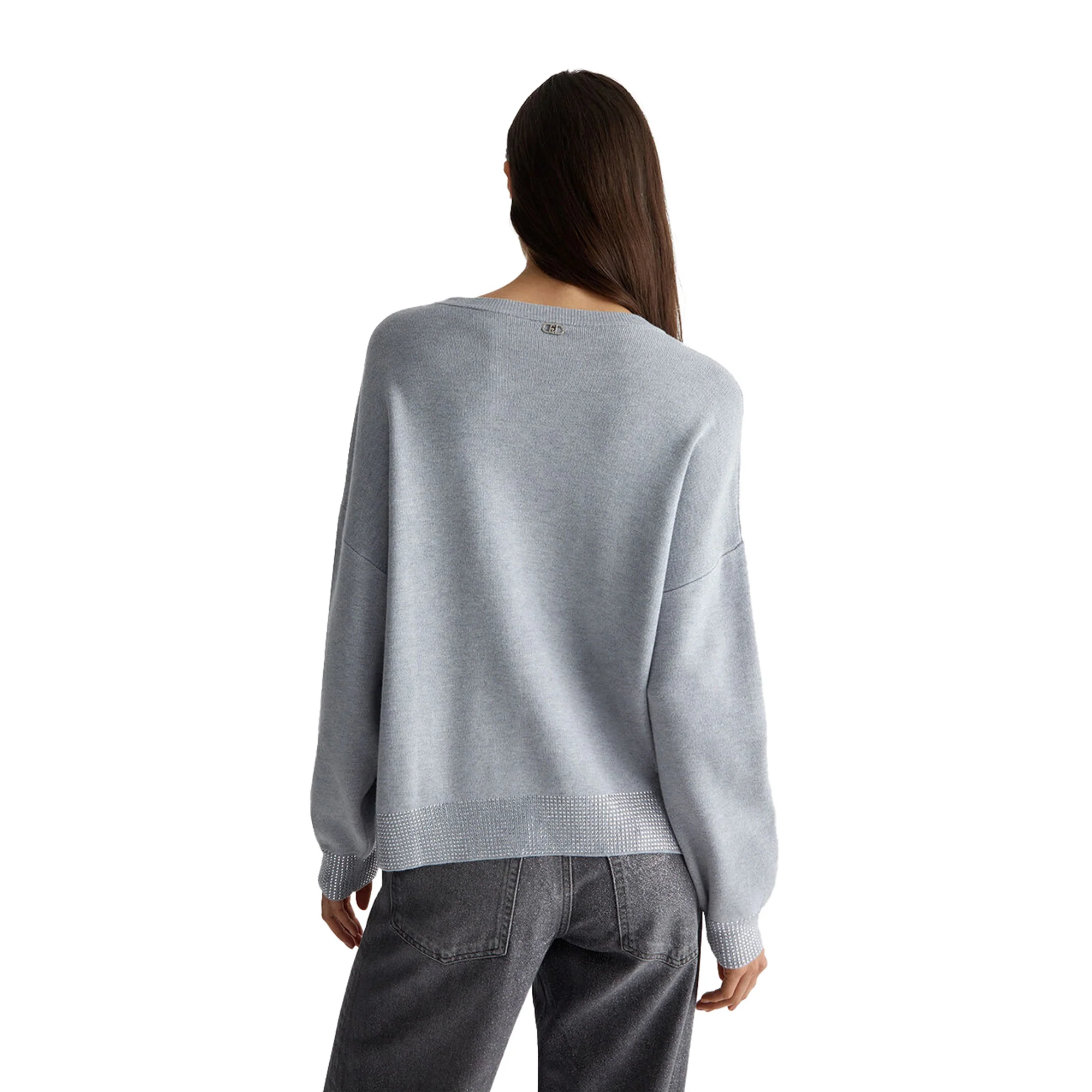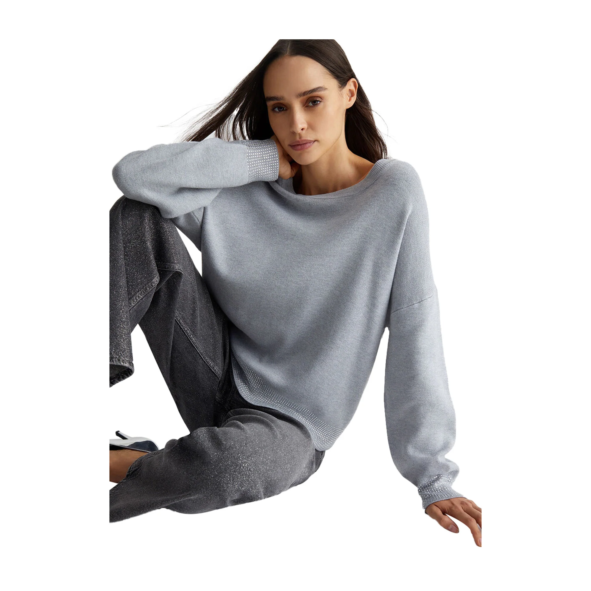 Rendi brillante il tuo look con la maglia girocollo donna con strass grigio di Liu Jo. La vestibilità regular fit garantisce comfort e praticità, mentre i dettagli in strass sui bordi e il logo sul retro aggiungono eleganza e stile. Scollo rotondo e maniche lunghe per una comodità unica. Disponibile in tinta unita.