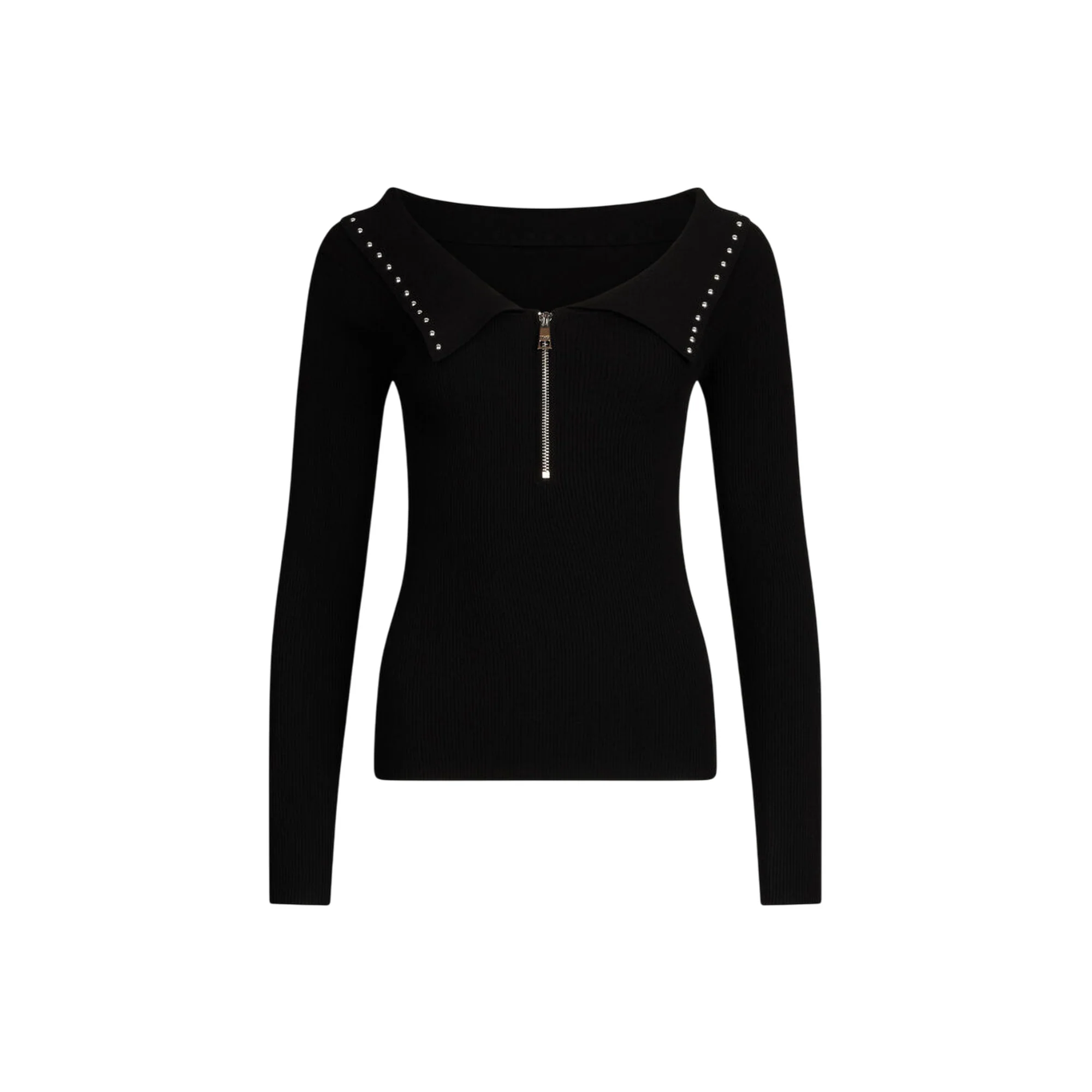 Scopri l’eleganza audace di questa Maglia nera da donna con zip e borchie firmata Liu Jo. Lo scollo Bardot valorizza le spalle in modo raffinato, mentre le maniche lunghe e il tessuto stretch avvolgono la silhouette con comfort e stile. I dettagli in galvanica silver, come la zip e le borchiette, aggiungono un tocco grintoso che rende ogni look unico e contemporaneo. Perfetta per chi vuole distinguersi con classe in ogni occasione.