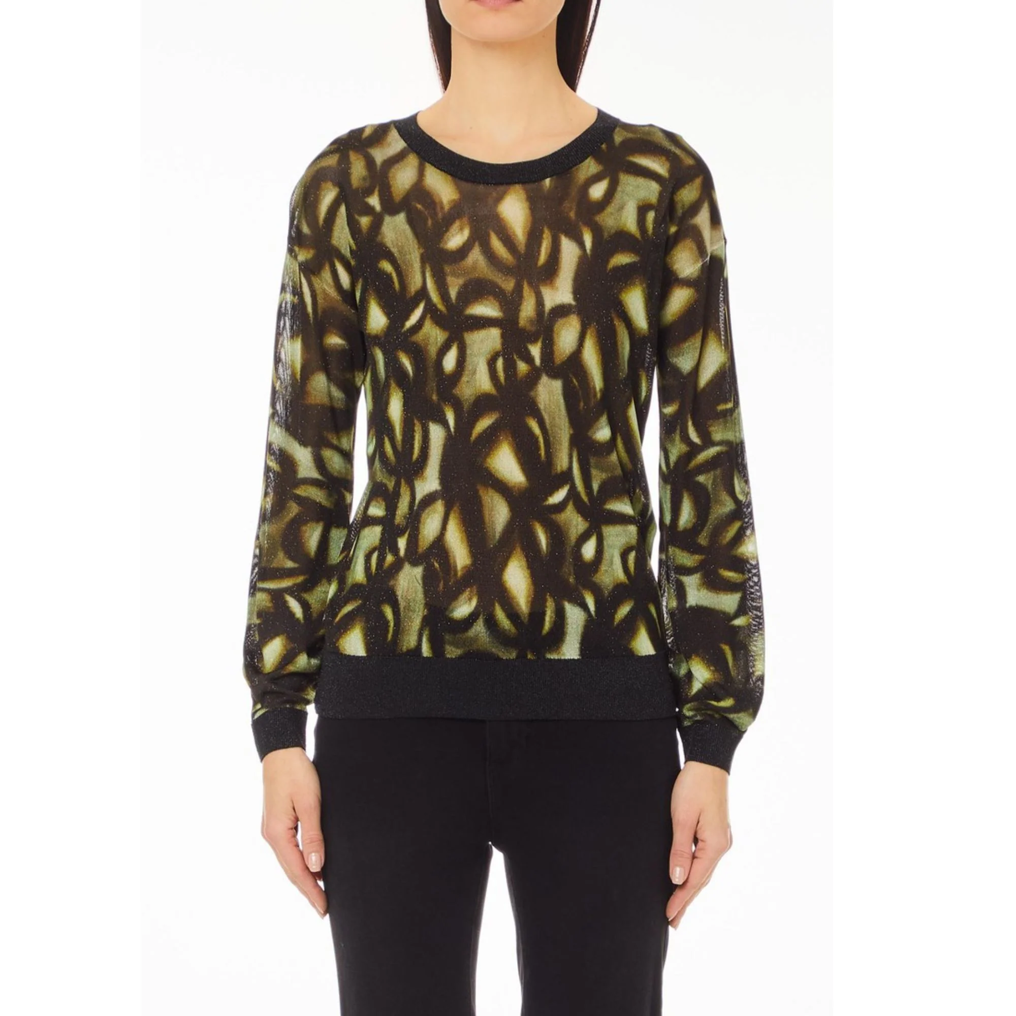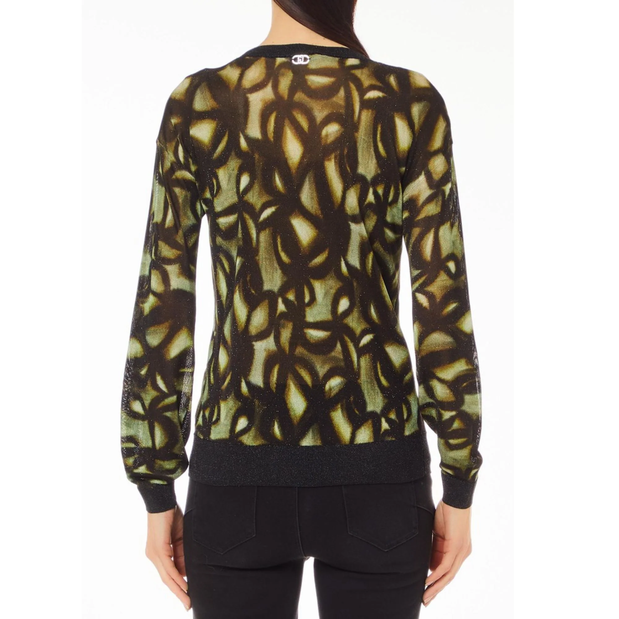 Questa maglia donna con spalle scese firmata Liu Jo presenta un motivo all-over e un vestibilità aderente, perfetti per un look alla moda e confortevole. Le maniche leggermente a sbuffo e il bordo in maglia a coste donano un tocco di femminilità, mentre la targhetta con logo LJ aggiunge un dettaglio elegante. Perfetta per ogni occasione!