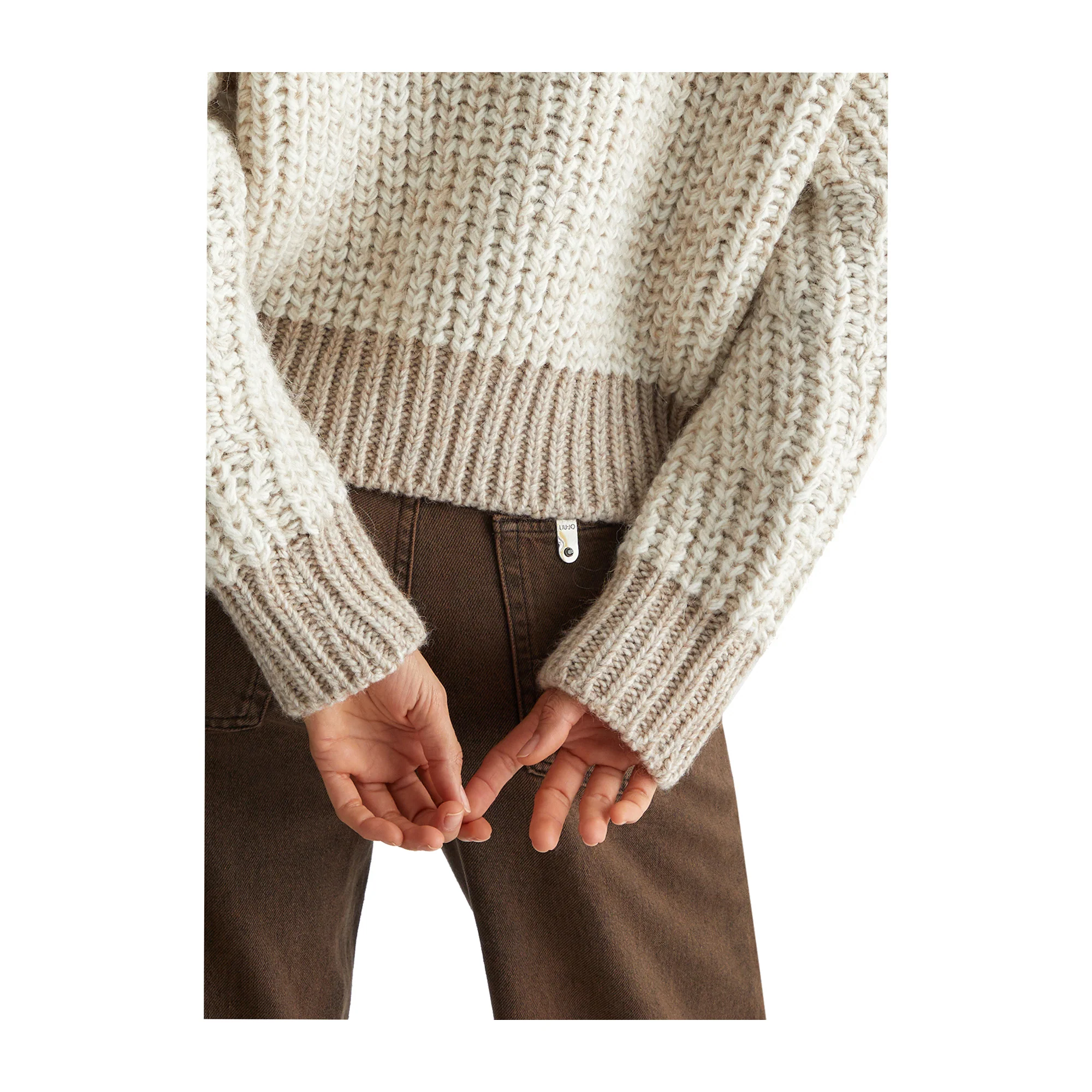 Questo Maglione di misto lana Beige di Liu Jo presenta una lavorazione a trecce sul davanti, uno scollo a barca e maniche lunghe per un look elegante. Il logo in metallo sul retro aggiunge un tocco di stile, mentre i bordi a coste in un colore più scuro offrono una finitura raffinata. Un capo essenziale per l’autunno e l’inverno!