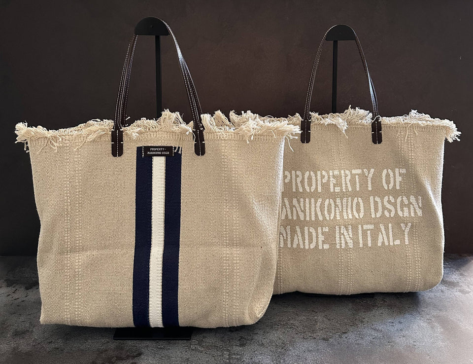 n°2 project e’ la shopper in cotone tessuto a grana grezza , manici in cuoio con luce 22cm perfetti per una portabilita’ anche a spalla . etichetta property-manikomio dsgn in cuoio e grande scritta property manikomio dsgn made in italy serigrafata sul retro della shopper, banda colorata che ,serigrafata verticalmente a mano sul fronte ,all’interno abbiamo inserito una maxi pochette 33x17x10 cm in tessuto . maxi pochette per dare una estrema sicurezza al contenuto della tua shopper e che potra’ anche essere utilizzata anche da sola …