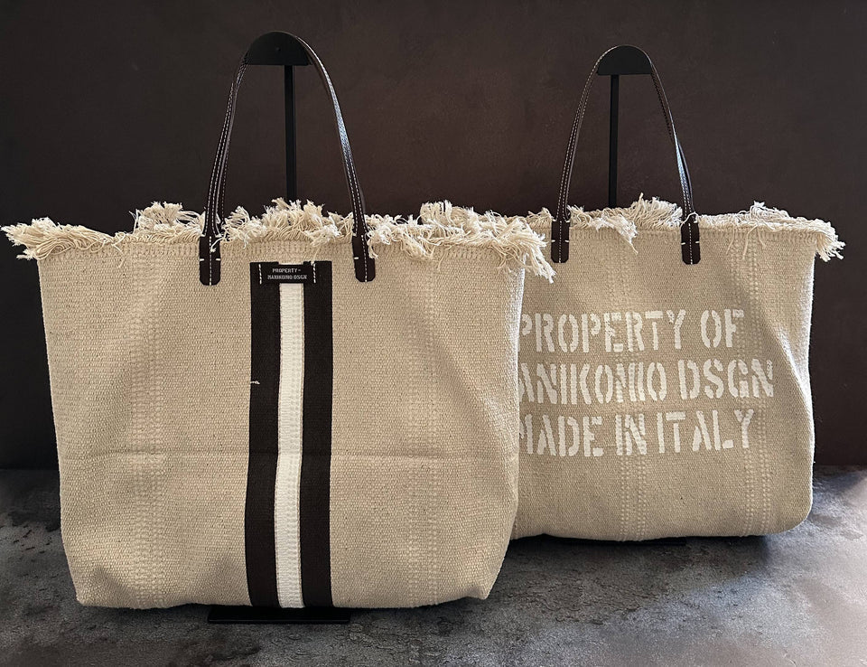 n°2 project e’ la shopper in cotone tessuto a grana grezza , manici in cuoio con luce 22cm perfetti per una portabilita’ anche a spalla . etichetta property-manikomio dsgn in cuoio e grande scritta property manikomio dsgn made in italy serigrafata sul retro della shopper, banda colorata che ,serigrafata verticalmente a mano sul fronte ,all’interno abbiamo inserito una maxi pochette 33x17x10 cm in tessuto . maxi pochette per dare una estrema sicurezza al contenuto della tua shopper e che potra’ anche essere utilizzata anche da sola …