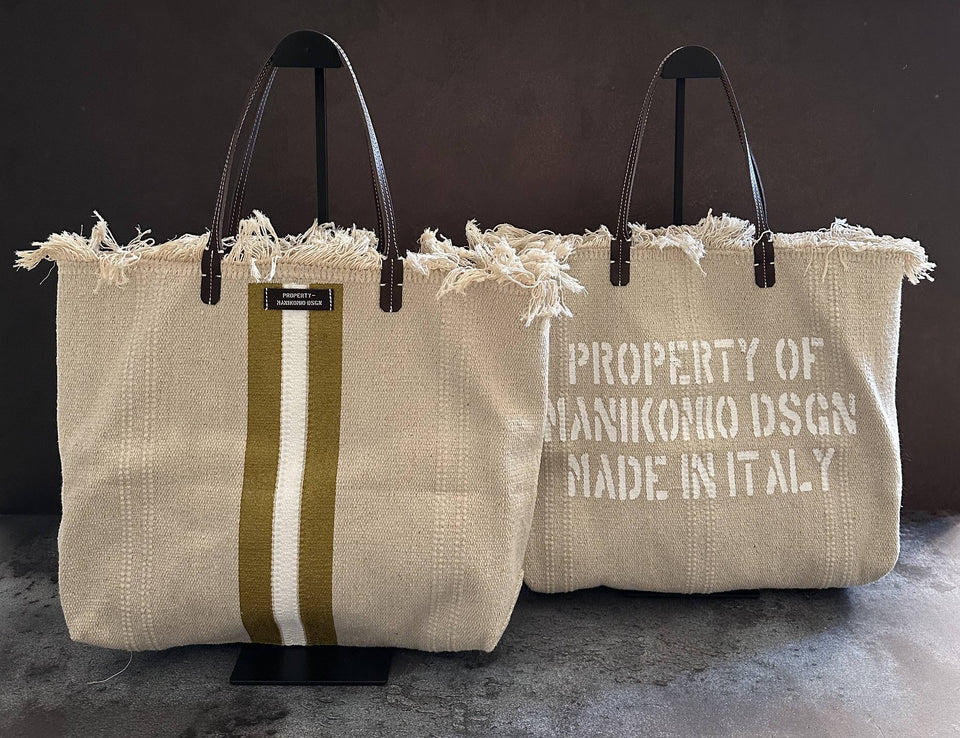 n°2 project e’ la shopper in cotone tessuto a grana grezza , manici in cuoio con luce 22cm perfetti per una portabilita’ anche a spalla . etichetta property-manikomio dsgn in cuoio e grande scritta property manikomio dsgn made in italy serigrafata sul retro della shopper, banda colorata che ,serigrafata verticalmente a mano sul fronte ,all’interno abbiamo inserito una maxi pochette 33x17x10 cm in tessuto . maxi pochette per dare una estrema sicurezza al contenuto della tua shopper e che potra’ anche essere utilizzata anche da sola …