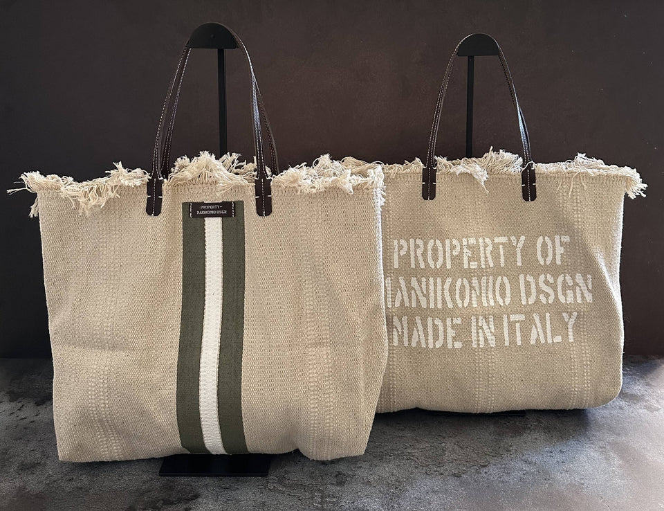 n°2 project e’ la shopper in cotone tessuto a grana grezza , manici in cuoio con luce 22cm perfetti per una portabilita’ anche a spalla . etichetta property-manikomio dsgn in cuoio e grande scritta property manikomio dsgn made in italy serigrafata sul retro della shopper, banda colorata che ,serigrafata verticalmente a mano sul fronte ,all’interno abbiamo inserito una maxi pochette 33x17x10 cm in tessuto . maxi pochette per dare una estrema sicurezza al contenuto della tua shopper e che potra’ anche essere utilizzata anche da sola …