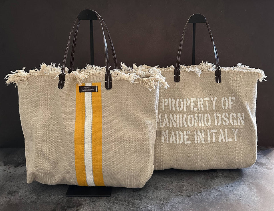 n°2 project e’ la shopper in cotone tessuto a grana grezza , manici in cuoio con luce 22cm perfetti per una portabilita’ anche a spalla . etichetta property-manikomio dsgn in cuoio e grande scritta property manikomio dsgn made in italy serigrafata sul retro della shopper, banda colorata che ,serigrafata verticalmente a mano sul fronte ,all’interno abbiamo inserito una maxi pochette 33x17x10 cm in tessuto . maxi pochette per dare una estrema sicurezza al contenuto della tua shopper e che potra’ anche essere utilizzata anche da sola …