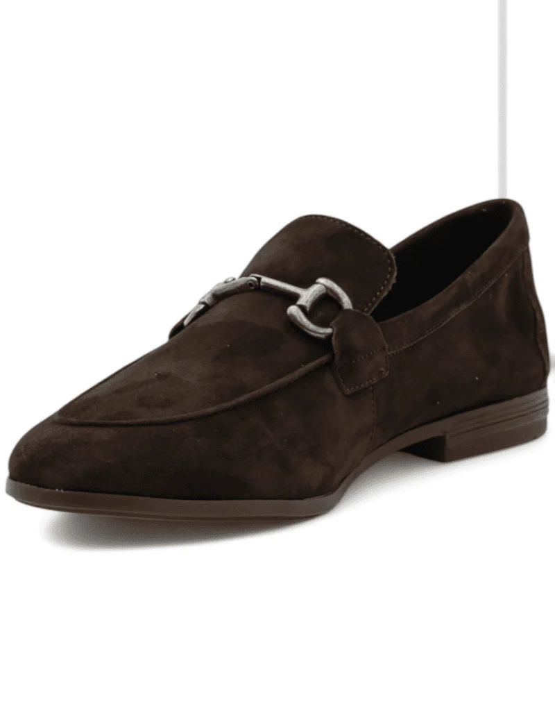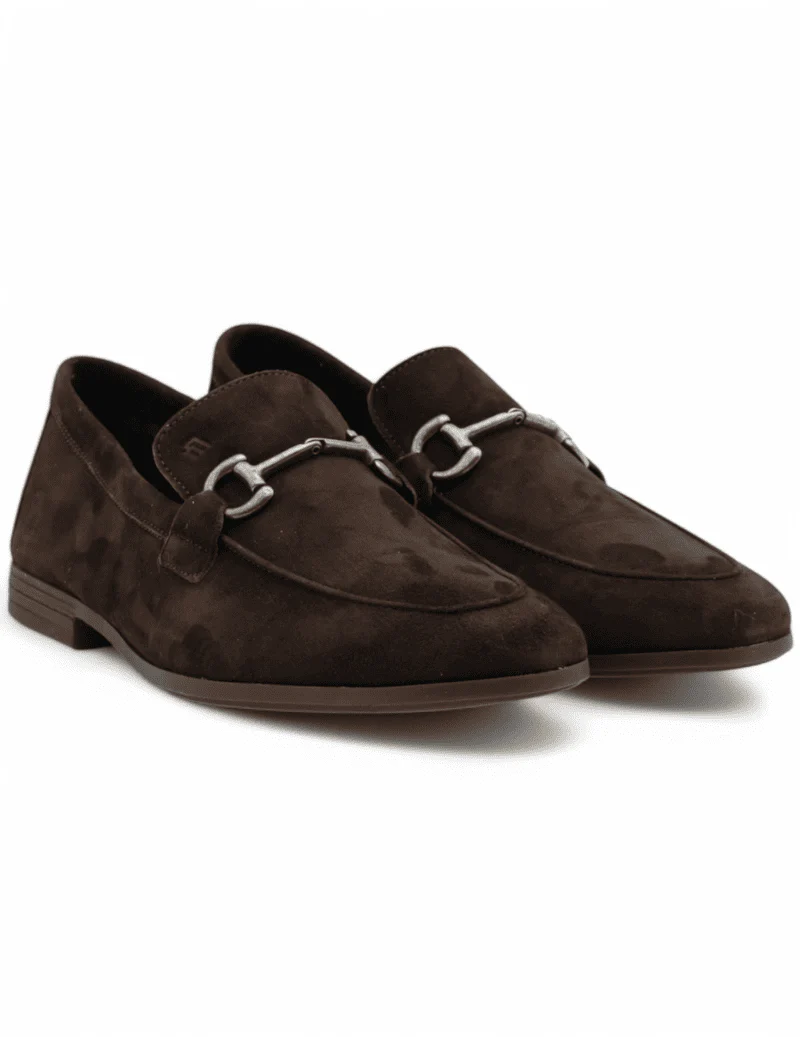 Un mocassino in pelle scamosciata con morsetto color ottone scuro.