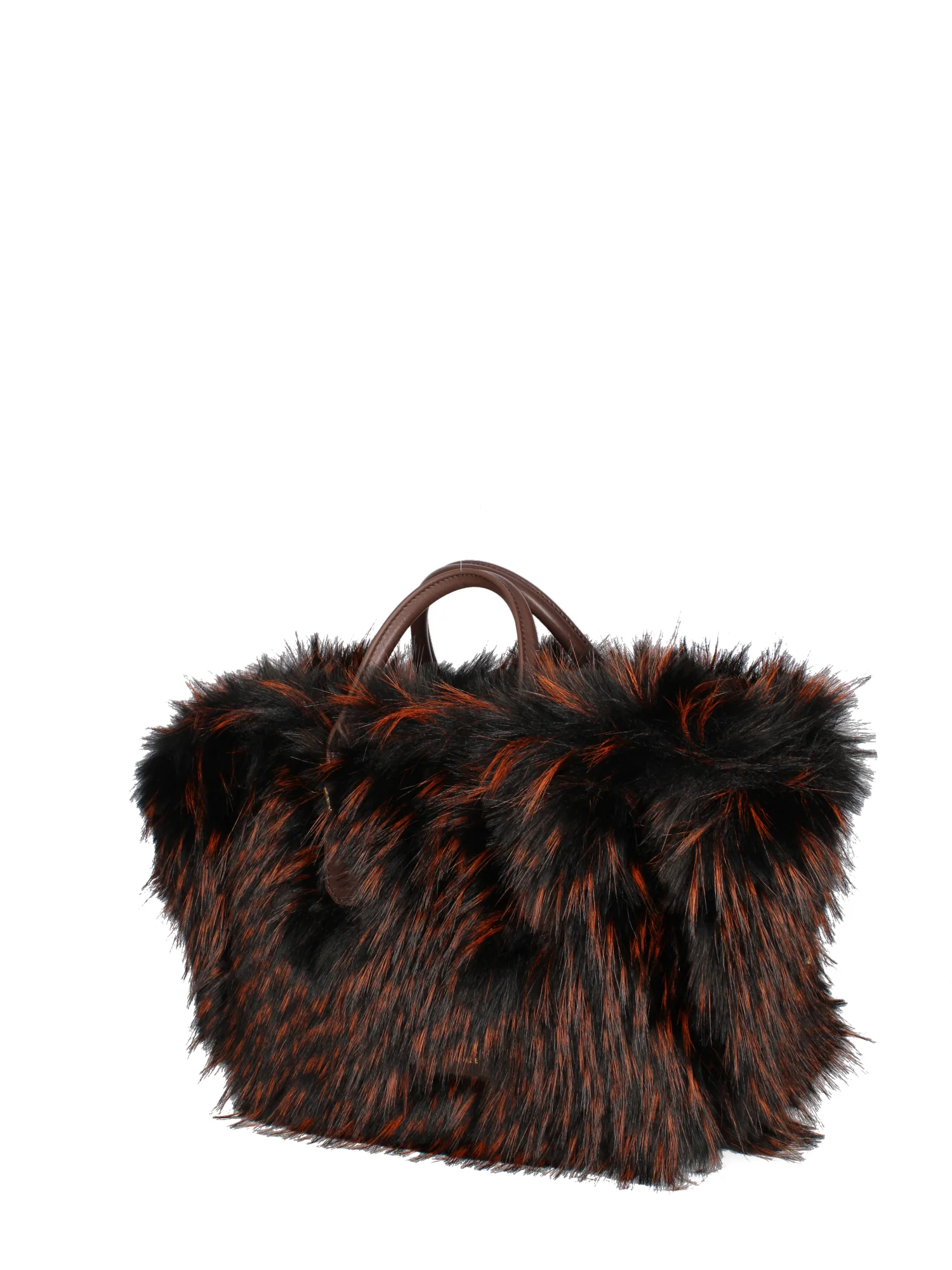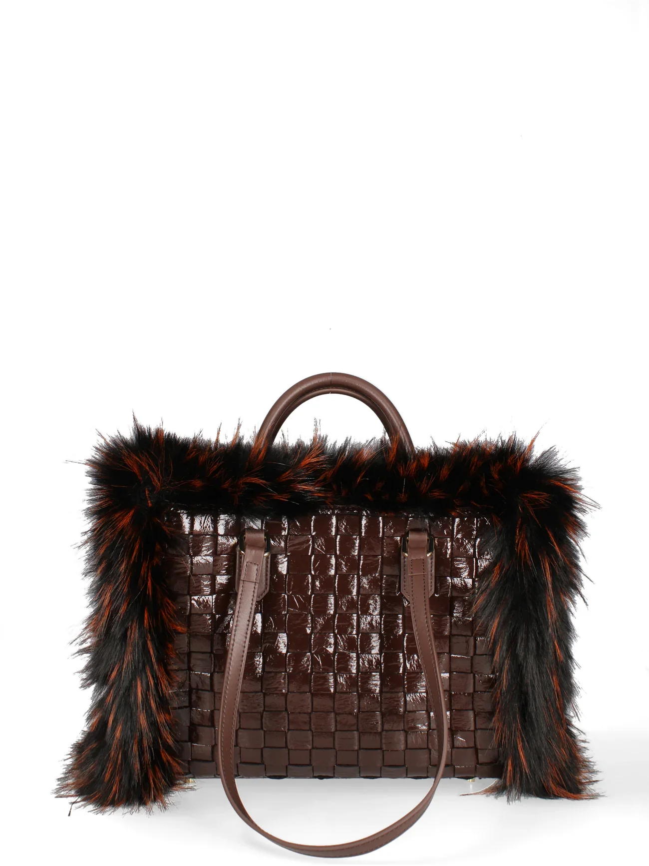 Borsa in pelle intrecciata ed ecopelliccia , reversibile. Pochette interna in tela. Doppi manici, tracolla regolabile.