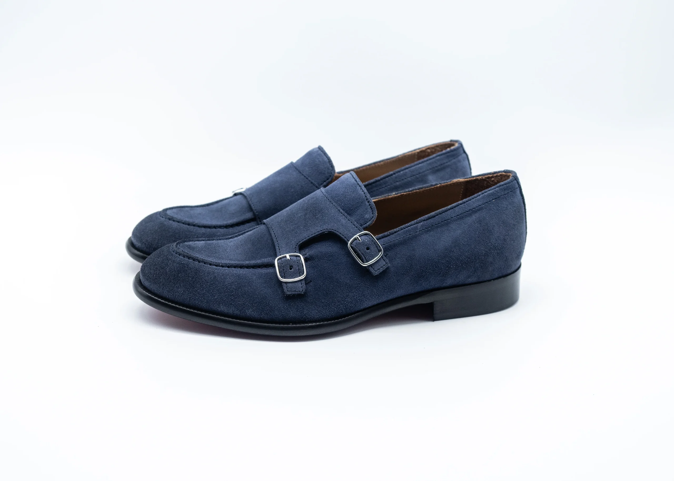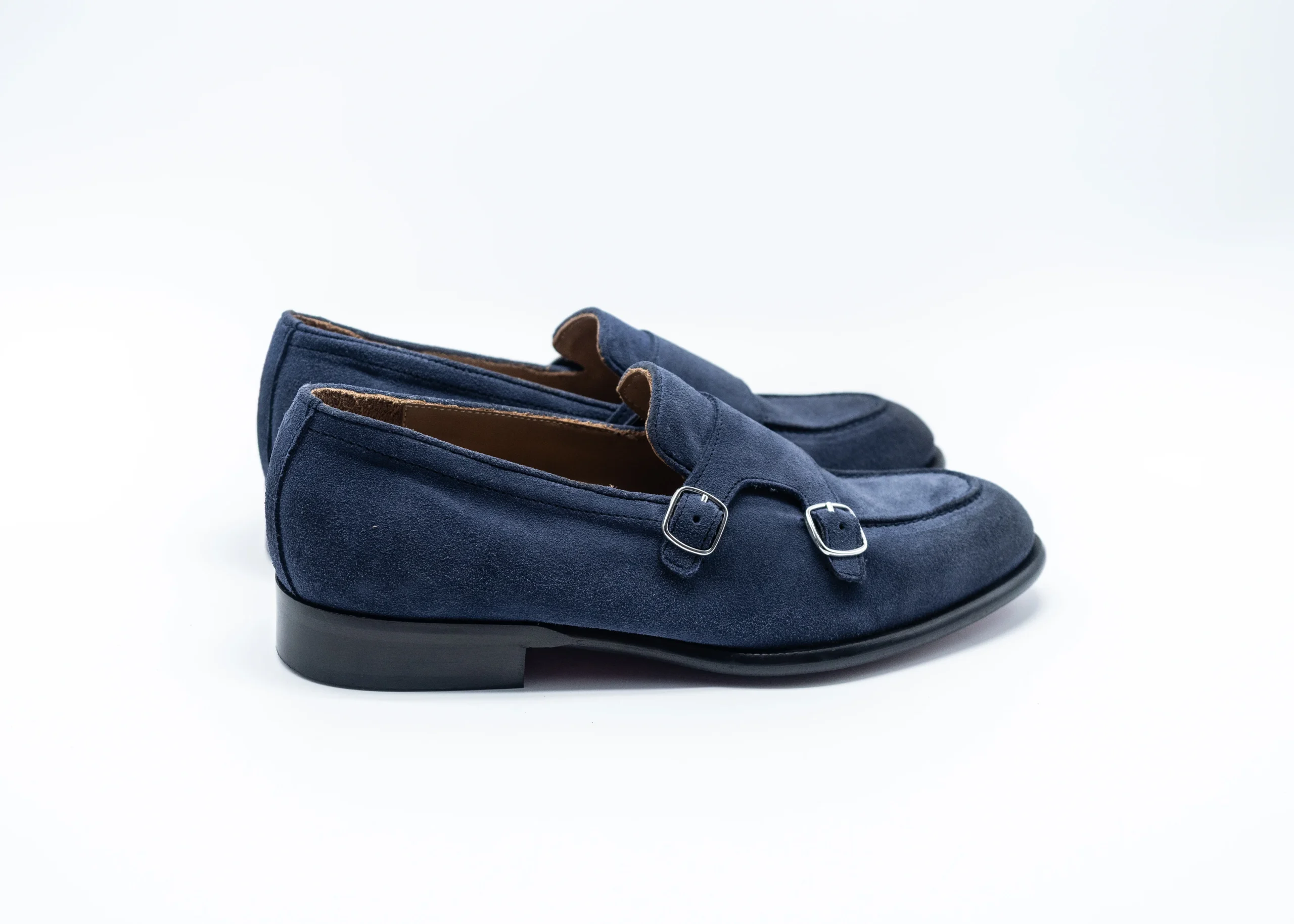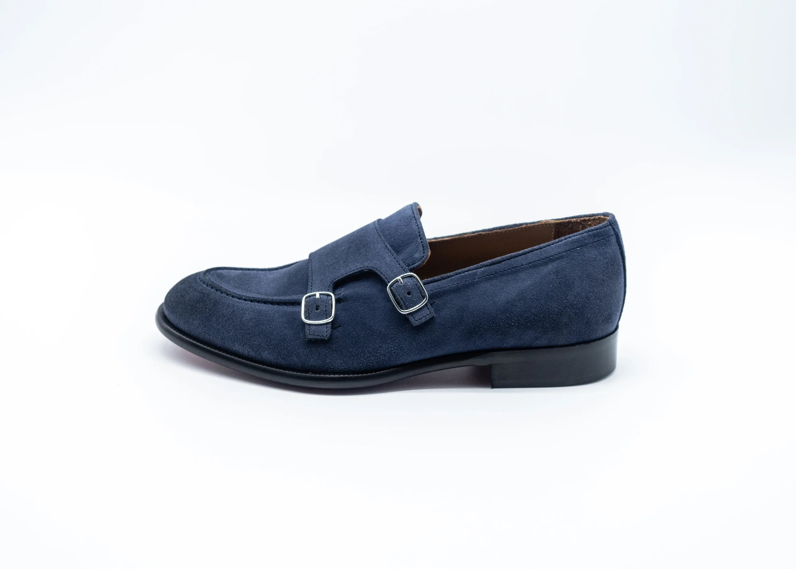 Mocassino con doppia fibbia regolabile in camoscio blu , suola in vero cuoio cucita .