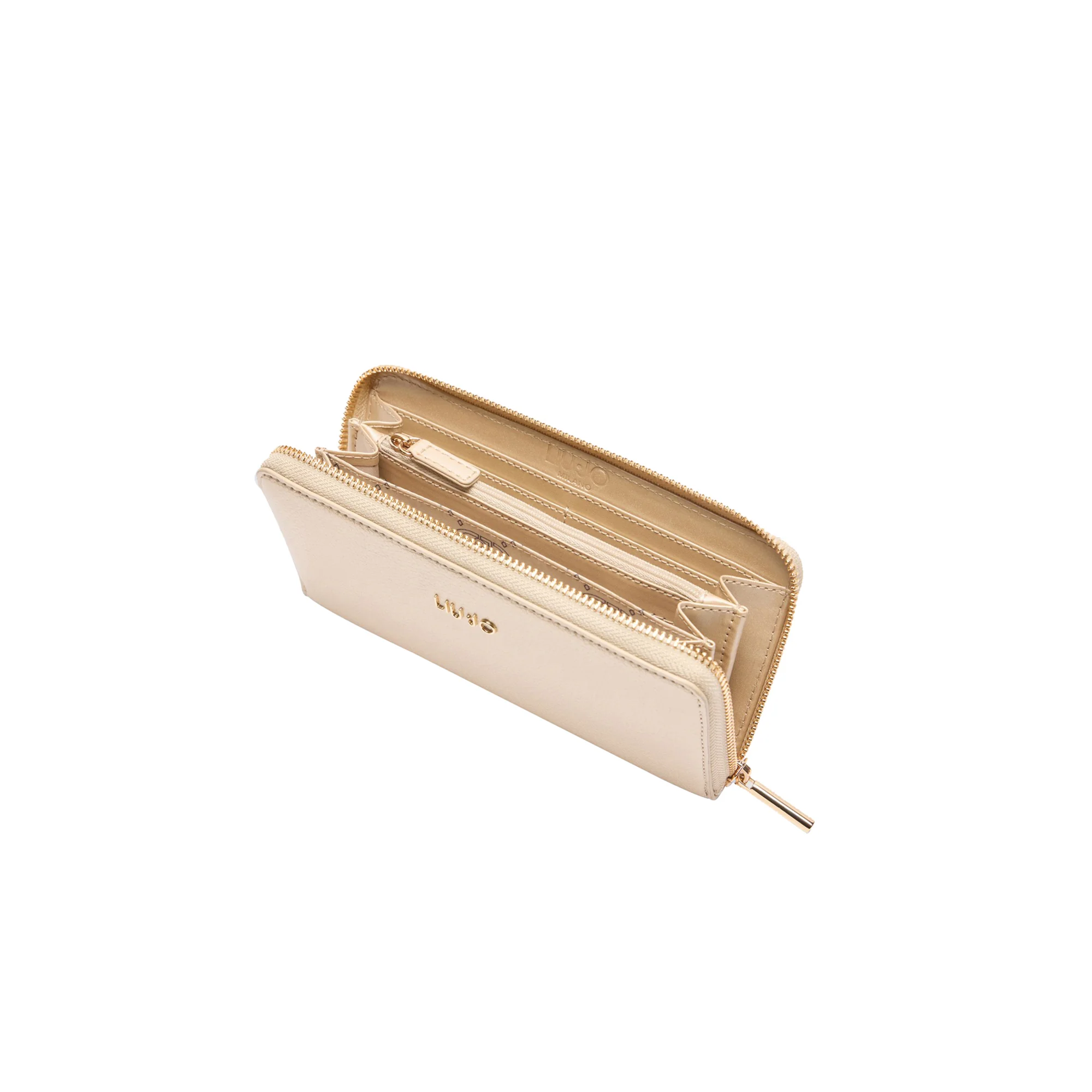 Il nostro Portafoglio Donna zip around grande Oro di Liu Jo è elegante e funzionale! Realizzato con effetto bottalato, ha un logo in metallo sulla parte anteriore. Include scomparti per tessere, monetine e banconote, per tenere tutto al sicuro. La chiusura con zip all around lo rende ancora più pratico e sicuro.