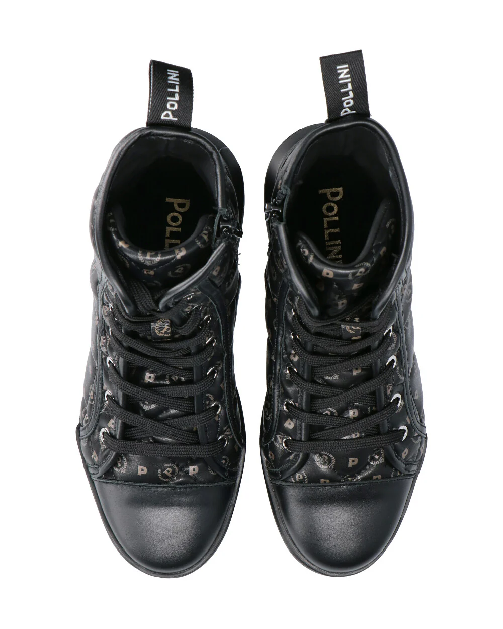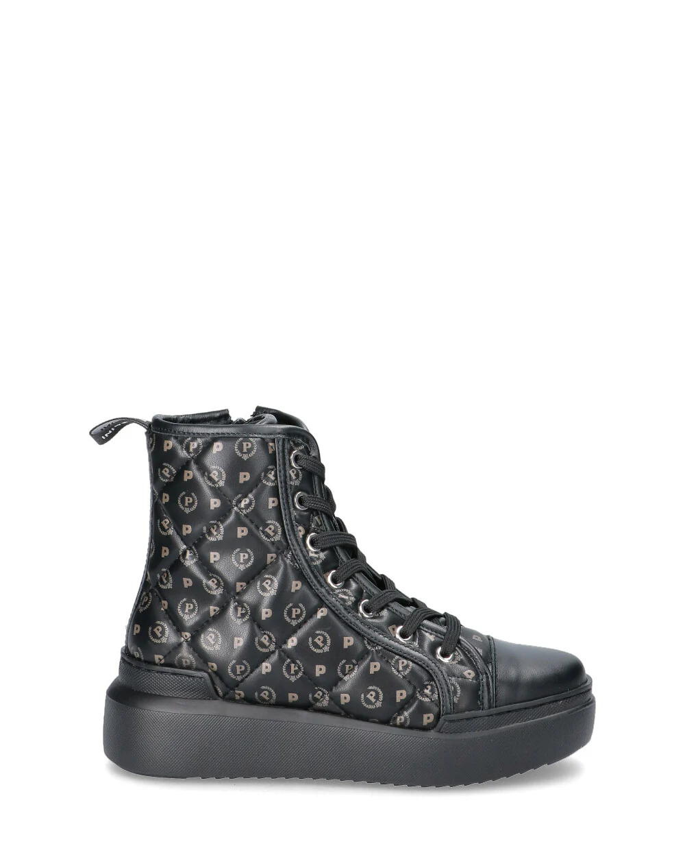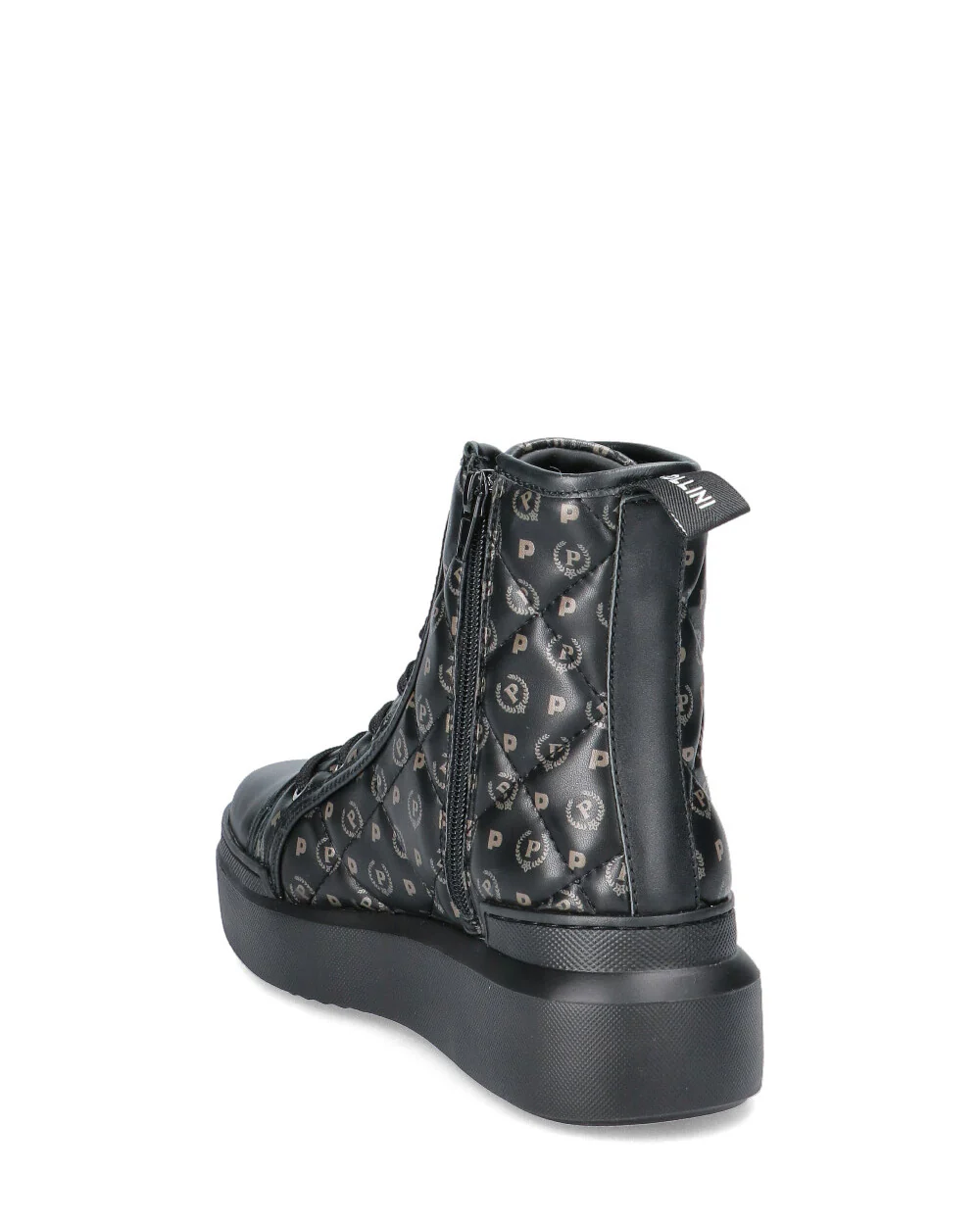Sneaker in ecopelle logata effetto matelassè, lacci e zip interna, fondo 4 cm.