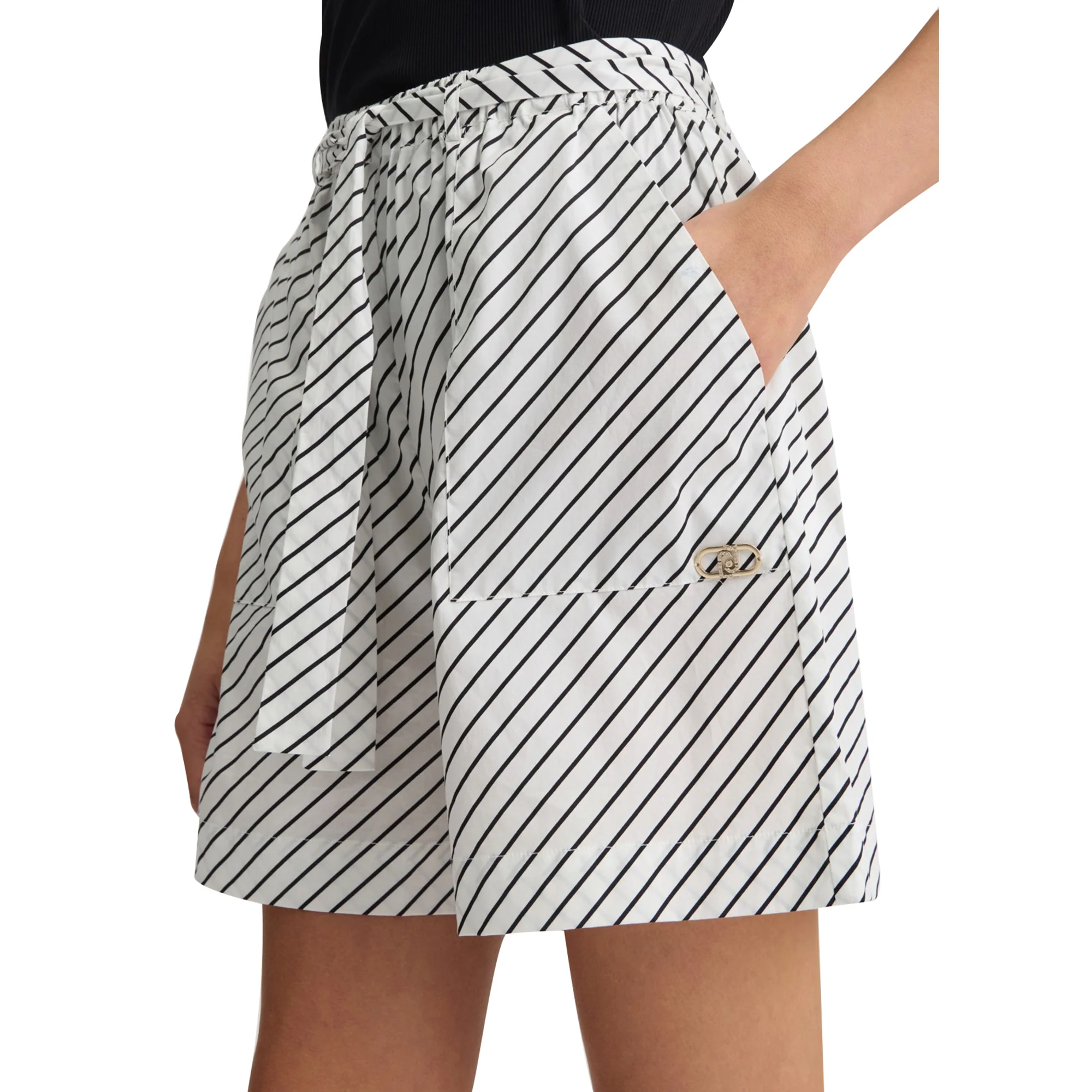 Rendi unico il tuo look estivo con i nostri Shorts in popeline a righe firmati Liu Jo. La stampa a righe all over dona un tocco di allegria, mentre le tasche sui fianchi e la cintura a tono ti offrono praticità. Completa il tuo outfit con il lettering LJ in metallo, per un tocco di stile in più.