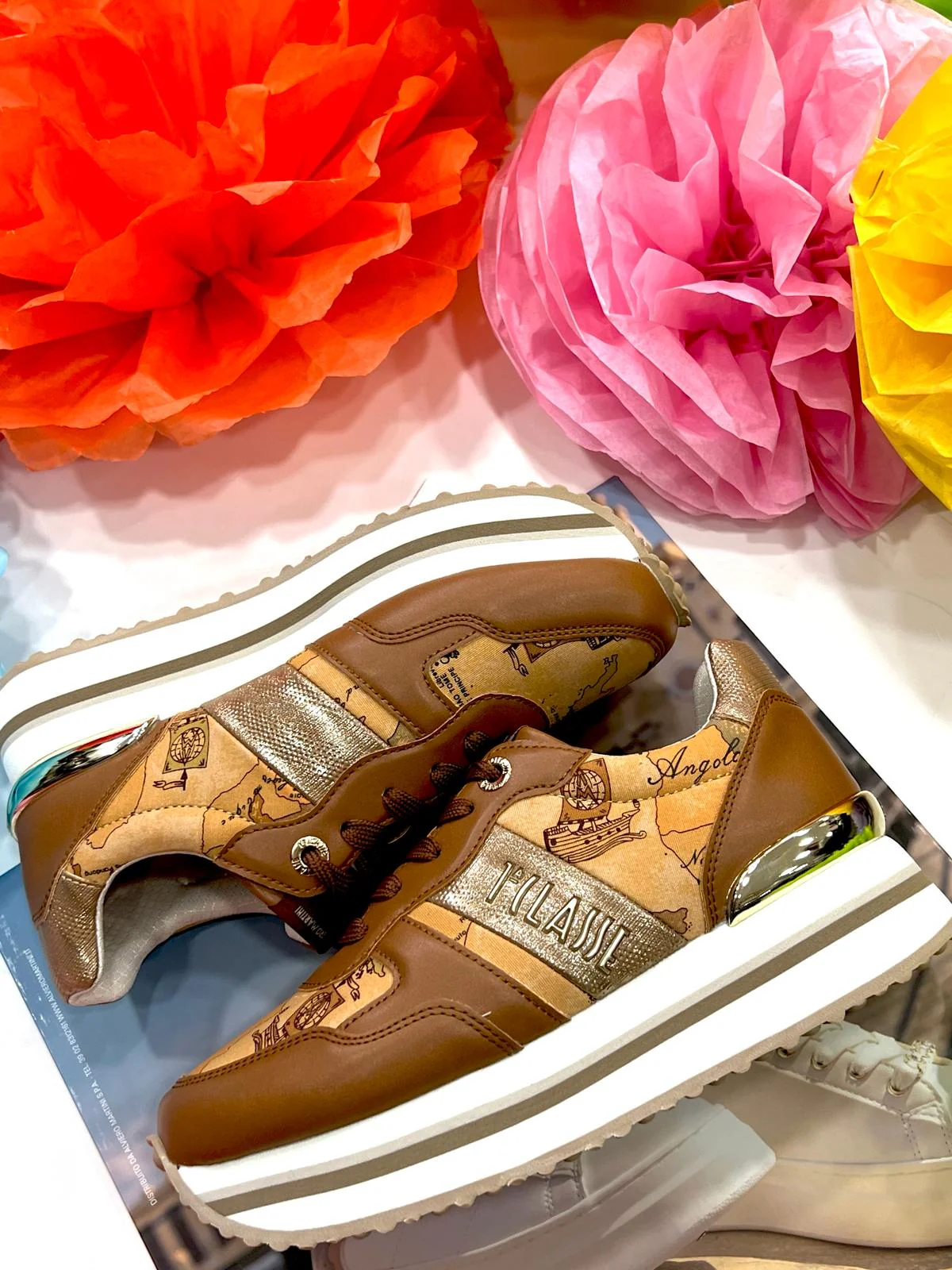 In morbida eco nappa, queste sneaker sono impreziosite dai dettagli nell’iconica stampa Geo Classic, rifiniti dai bordi laminati che illuminano le sfumature calde della mappa. Il fondo alto leggermente zeppato aggiunge un’impronta di carattere in più, per affrontare ogni giornata con sicurezza e classe.