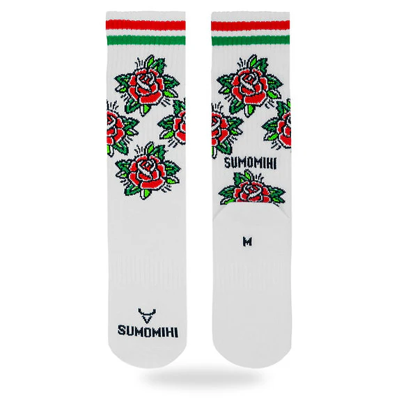 Calzini SUMOMIHI media lunghezza in morbido cotone. Colore bianco, rose tradizionali, tessitura Jacquard. COMPOSIZIONE 85% cotone, 12% poliammide, 3% elastan. LAVAGGIO Lavare massimo a 30°c, ciclo delicato.Stirare a temperatura massima di 110°c. Made in Italy