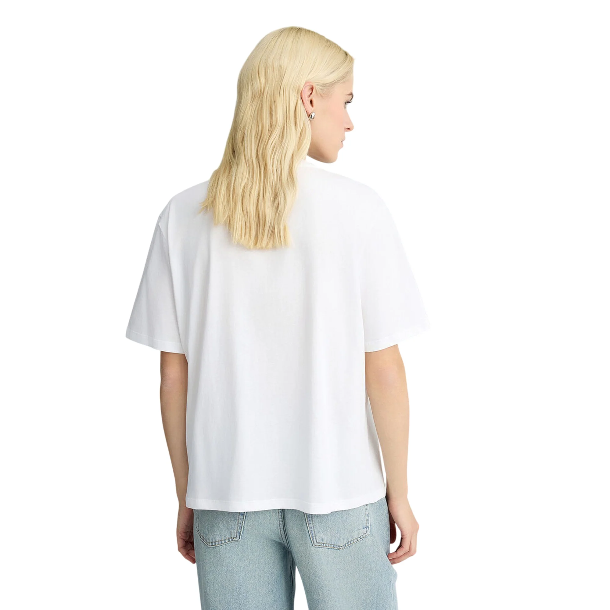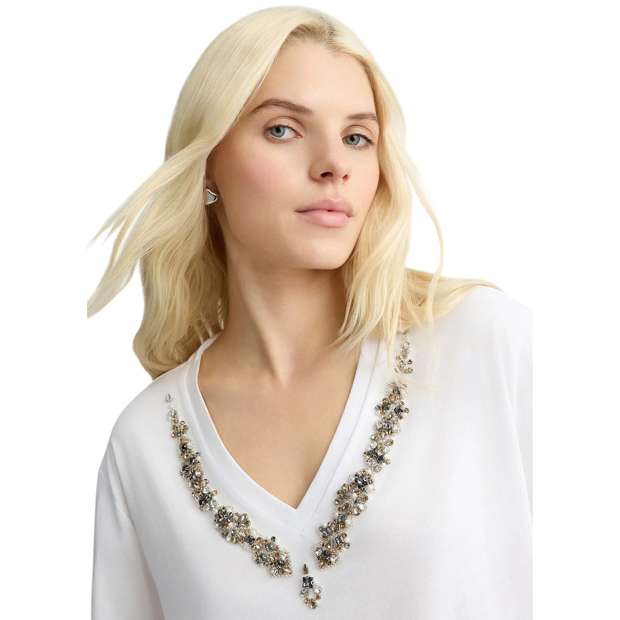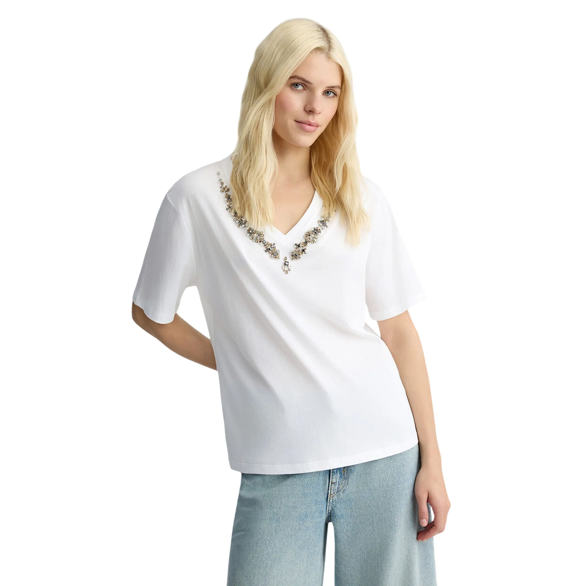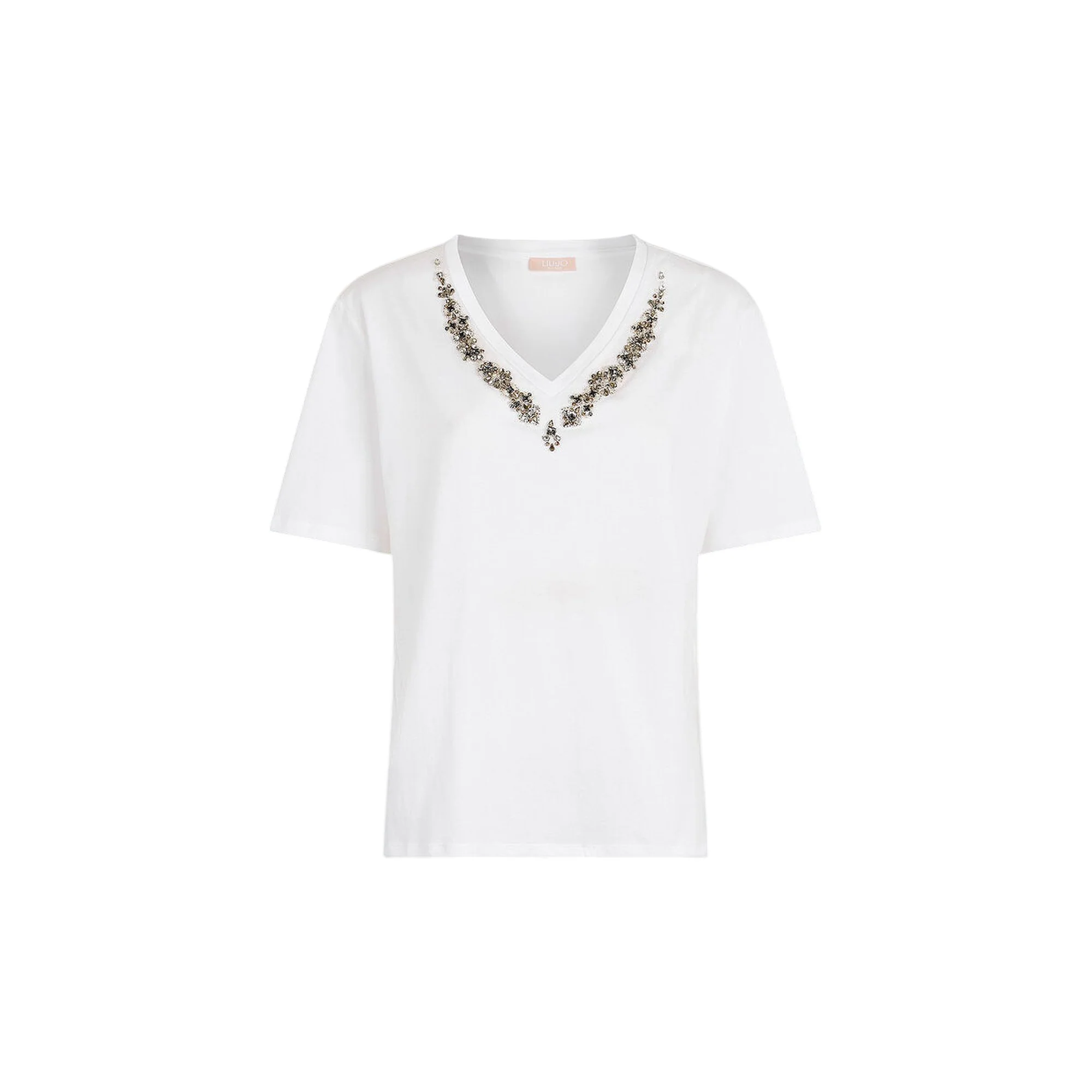 Questa T-shirt bianca da donna firmata Liu Jo unisce semplicità ed eleganza grazie al suo design a tinta unita e alle maniche corte, perfette per ogni stagione. Lo scollo a V impreziosito da strass applicati aggiunge un tocco di brillantezza e raffinatezza, rendendola ideale per occasioni casual ma anche per serate più sofisticate. Un capo versatile che valorizza ogni outfit con stile e luminosità.