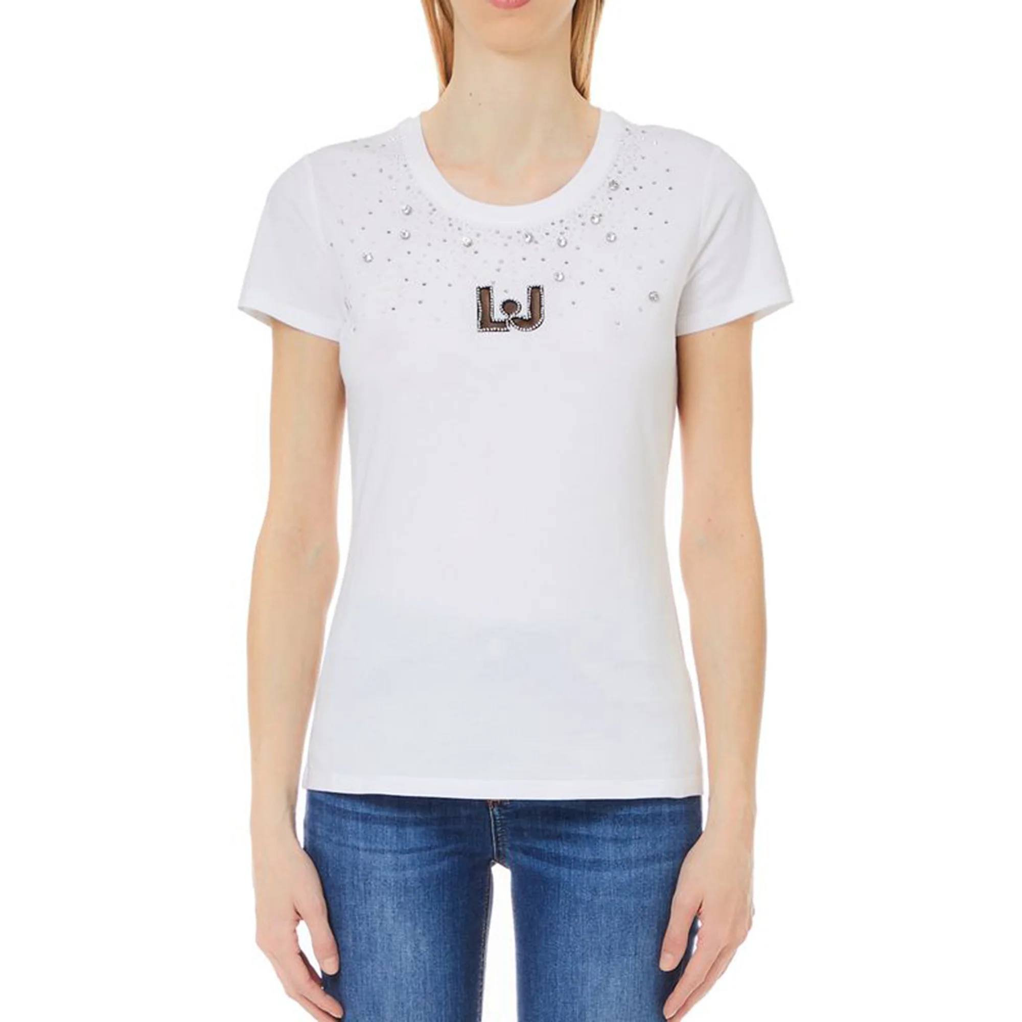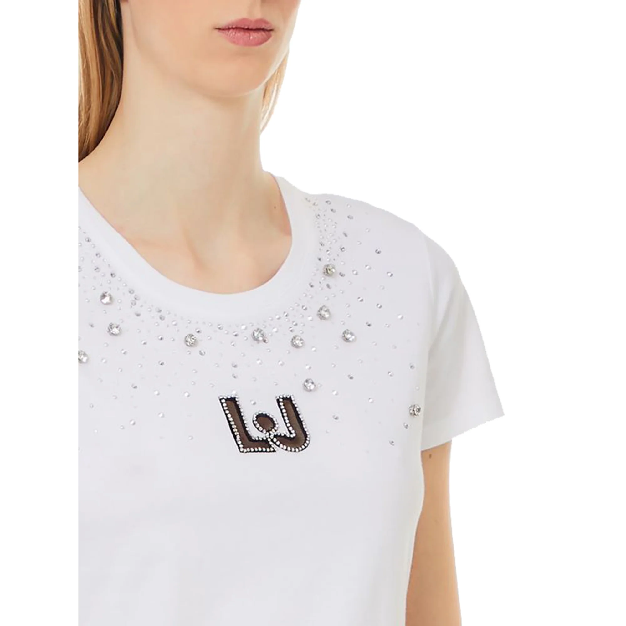 Aggiungi un tocco di luce ai tuoi look con questa T-shirt donna bianca di Liu Jo ricca di pietre e strass! In morbido cotone e tinta unita bianca potrai abbinarla al meglio senza perdere il tuo stile!