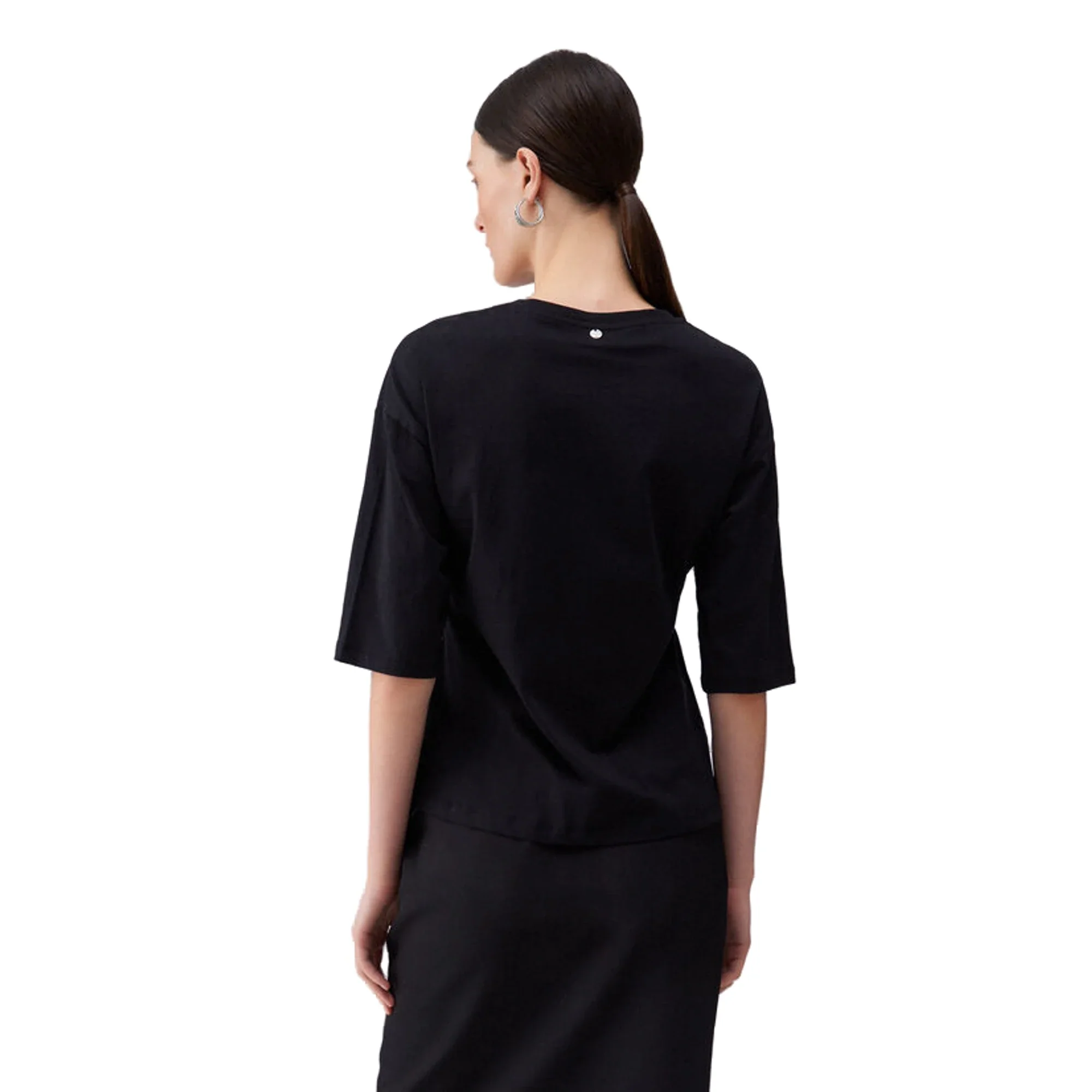 Rendi i tuoi look alternativi con la T-shirt Donna in colore nero firmata Liu Jo. Con maniche a lunghezza gomito, questa t-shirt nera versatile presenta un’applicazione gioiello sullo scollo che la rende unica e originale.